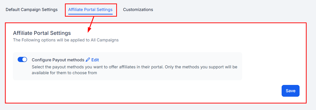 Control the Payout methods available to your affiliates by navigating to the Affiliate Portal Settings.
