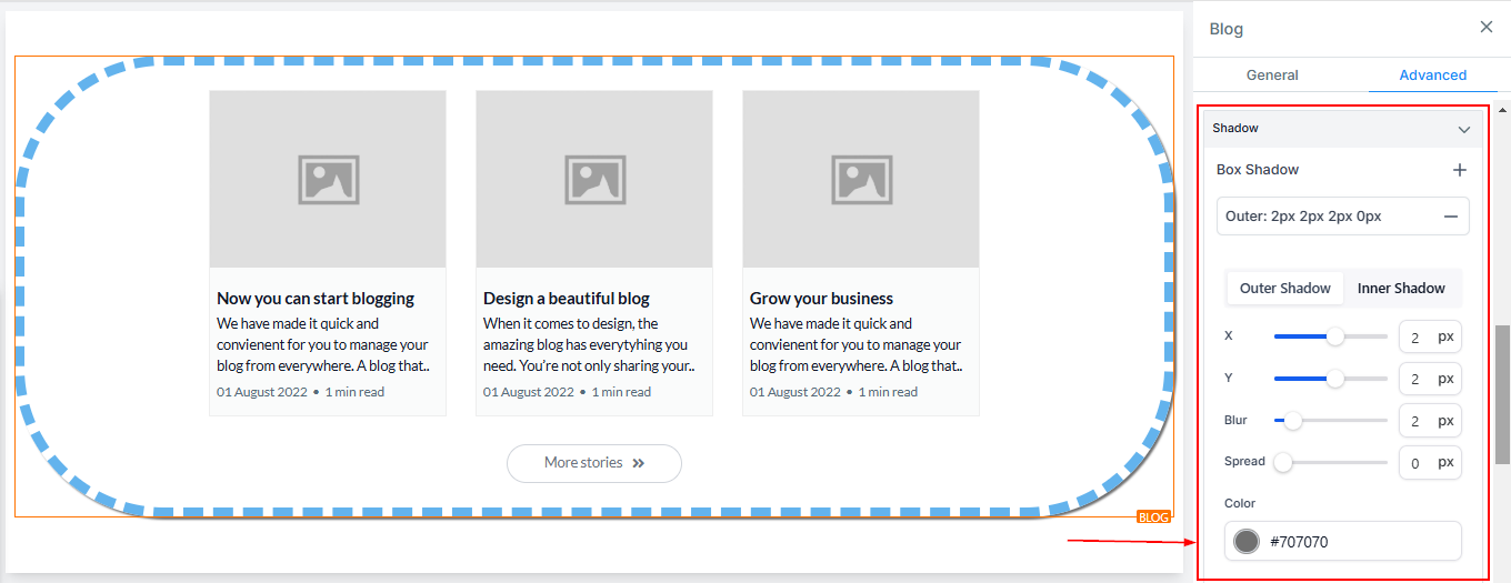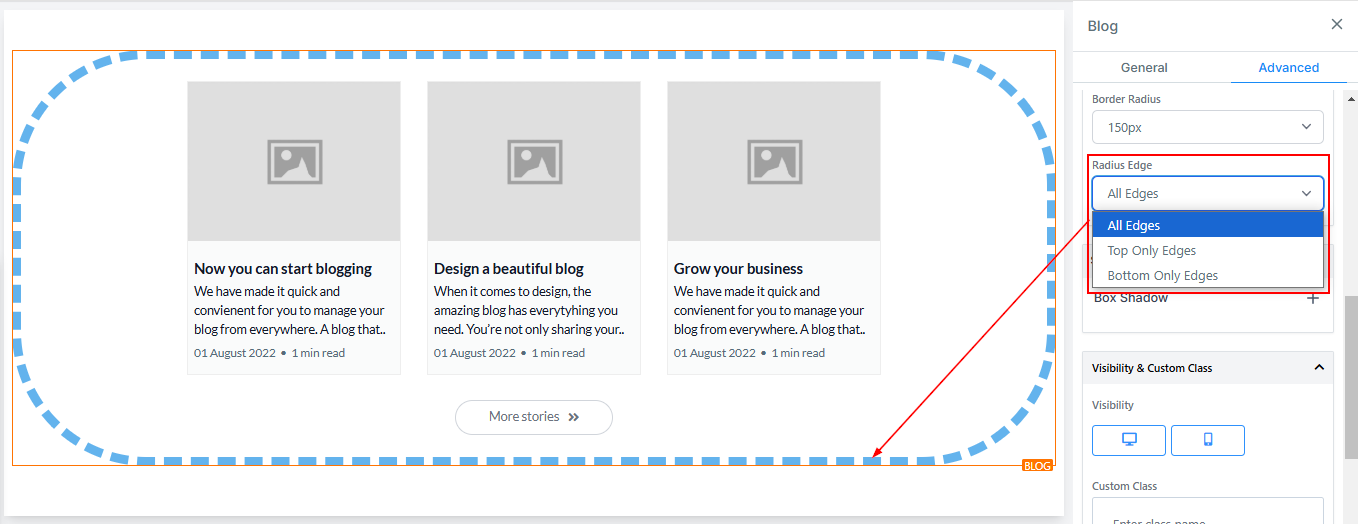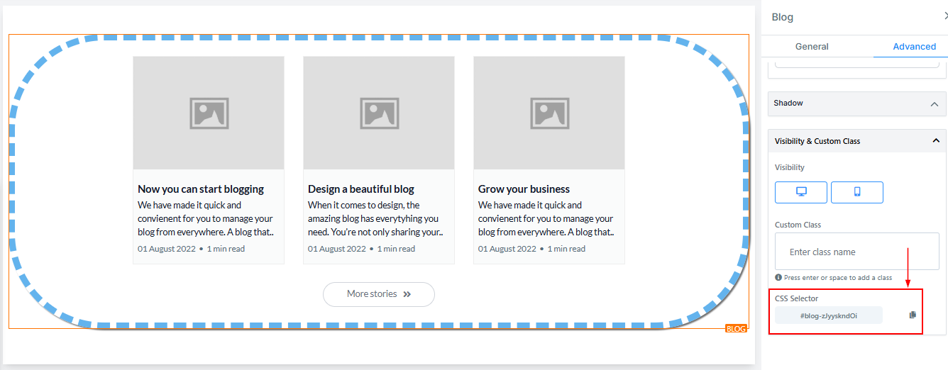 Advanced Settings provides several options to customize your blog post element. Here you have spacing options, the ability to add borders and shadows, as well as adjust visibility and add Custom CSS.