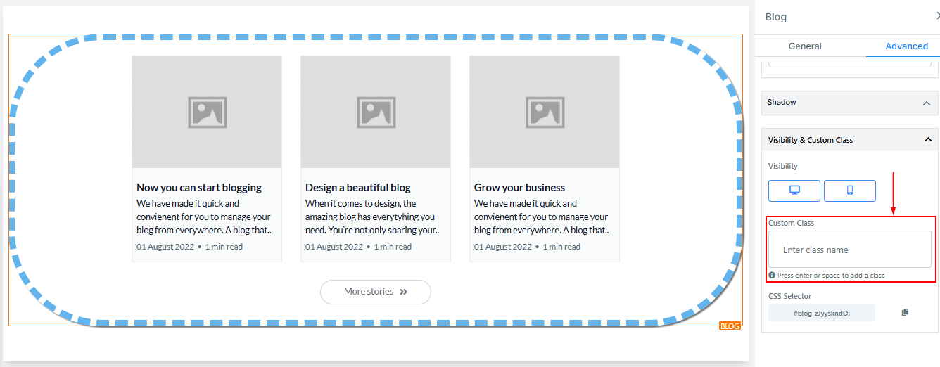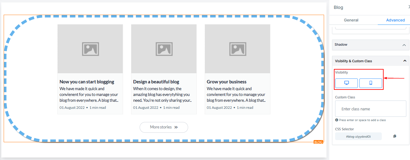 The Visibility setting allows you to determine whether your blog post element should be displayed on mobile devices, desktops, or both. You can select your preferences by highlighting the corresponding icon.
