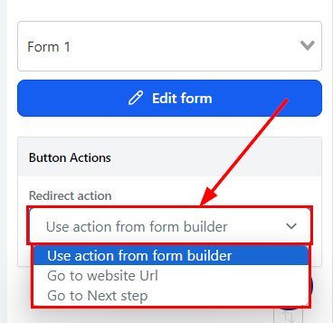- Redirect Action: The Button actions section provides options for what should happen when the customer clicks the submit button on the form. Here you can choose to open a URL, go to the next step in a funnel, or use the form submit options.