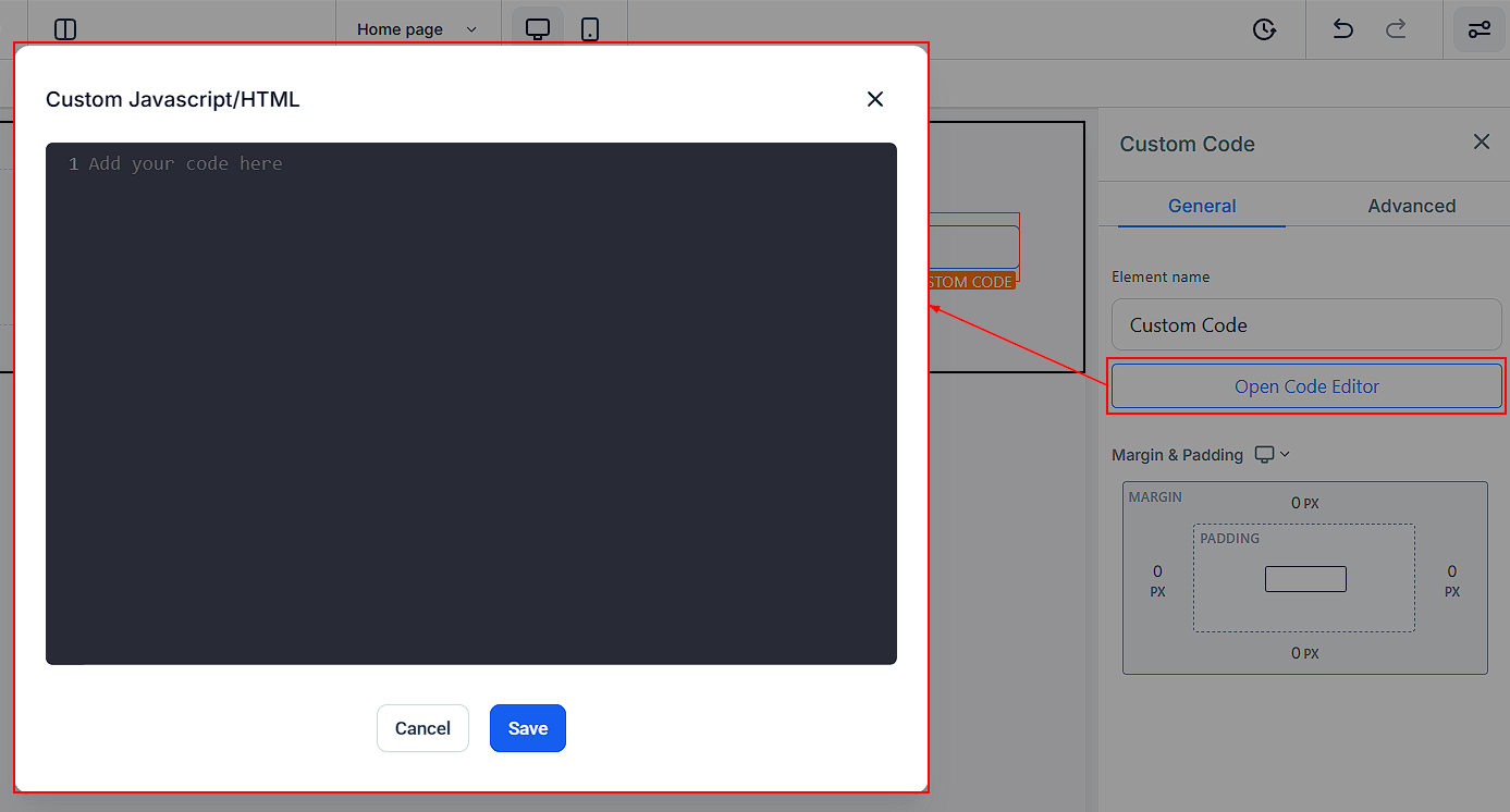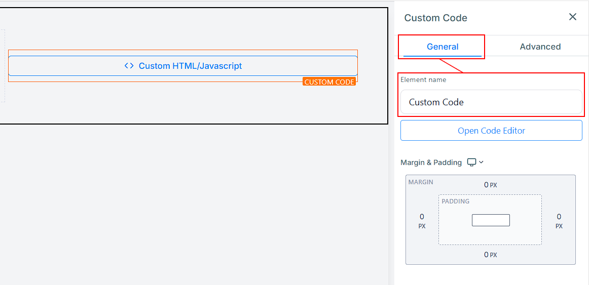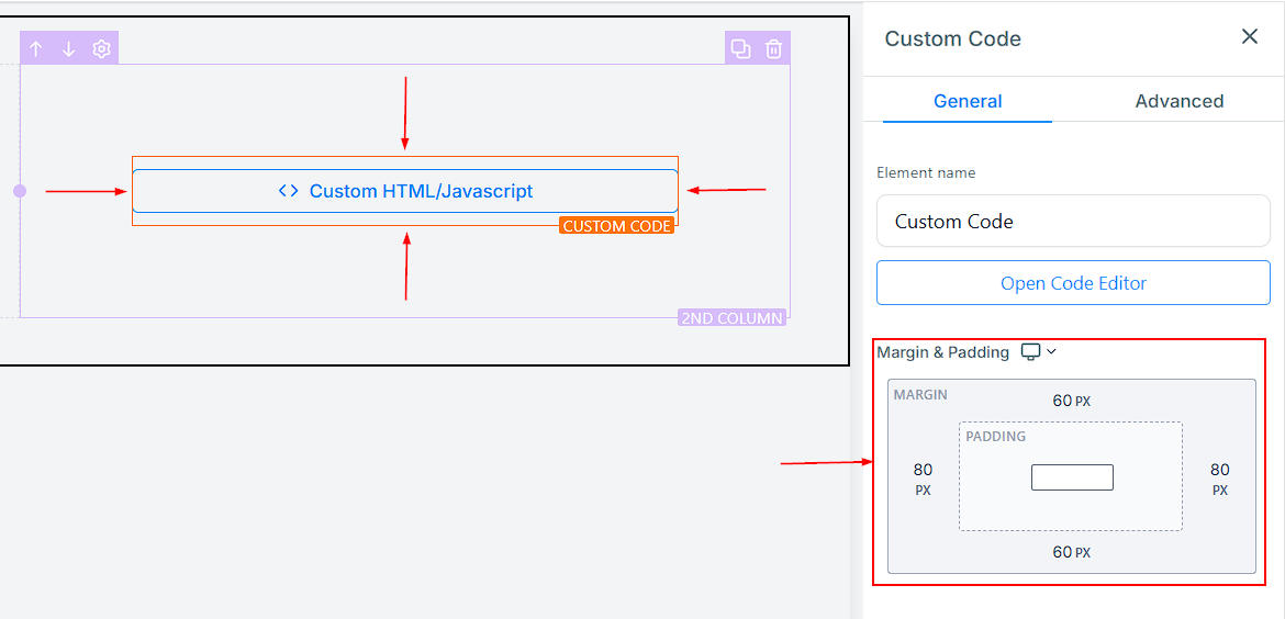 You can utilize the Open Code Editor button to input your custom code for your element. By clicking on this button, a pop-up window will appear, allowing you to type in or paste your code with ease. This feature provides you with the flexibility to add custom coding to your web page, enabling you to tailor the look and functionality of your elements to suit your specific needs.