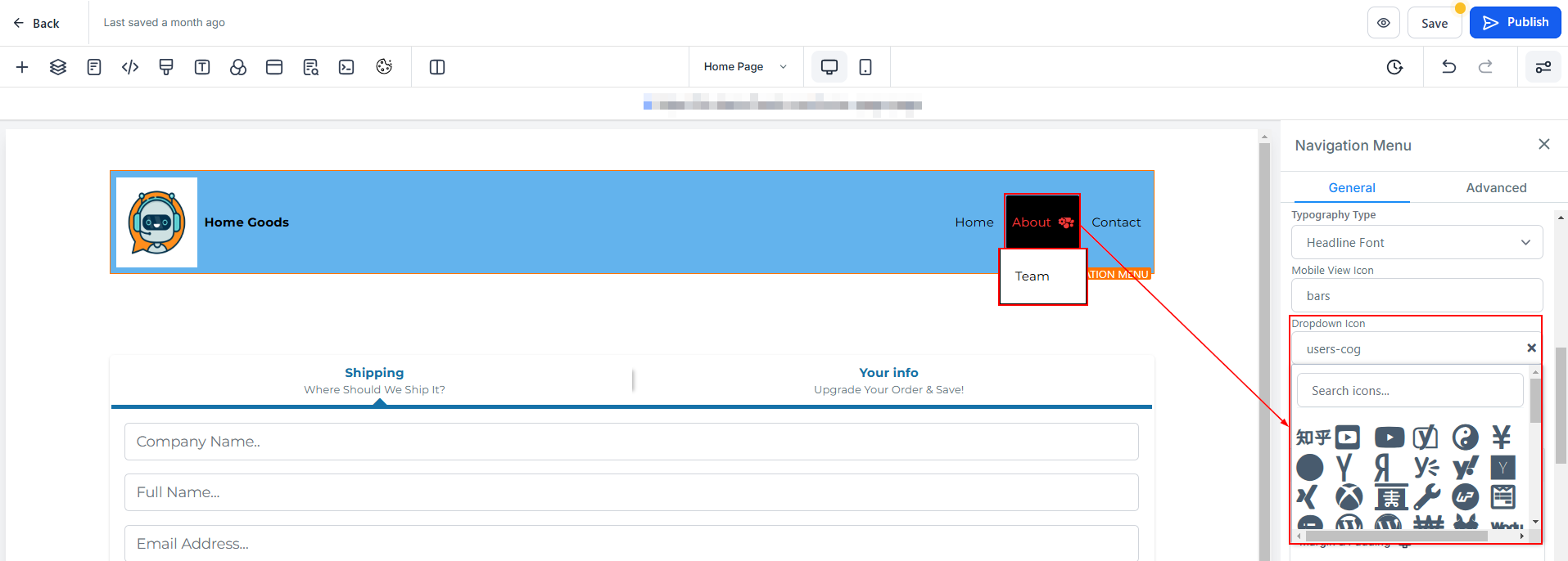 Add a dropdown icon to your menu by selecting from the available options in the style editor. The icon will indicate when an item can expand, and it includes a smooth rotation animation.