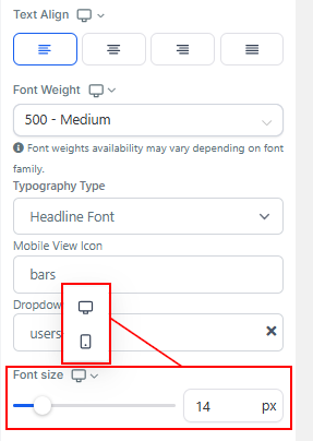 Adjust the font size of a particular text/content for both mobile and desktop devices easily by dragging the size bars. This feature enables you to customize the visual appearance of your content for optimal user experience. You can preview the mobile font size to ensure it is formatted correctly by toggling the mobile view in the top menu bar of the builder.