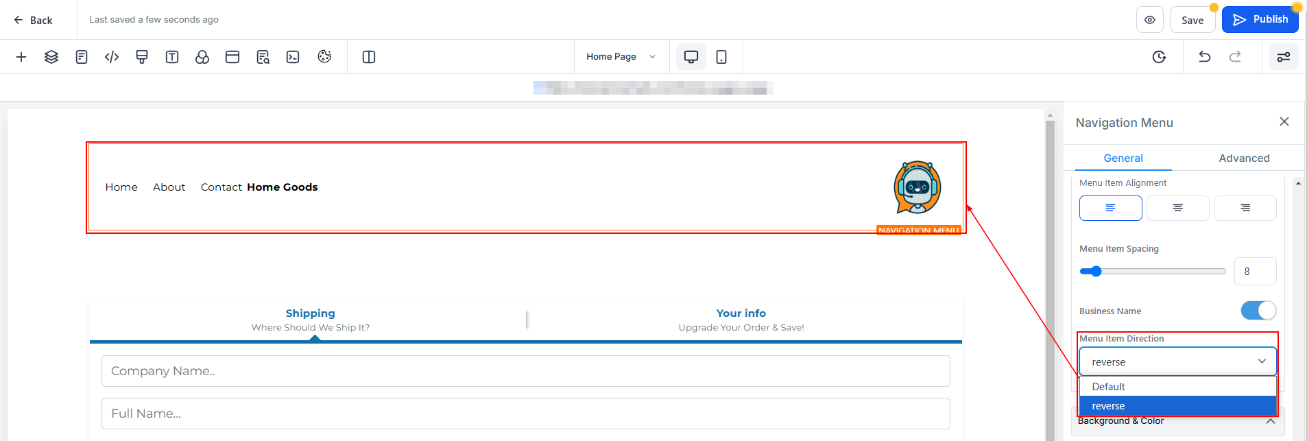 Menu Item Direction allows you to choose between displaying your navigation bar in the default or reversing order.