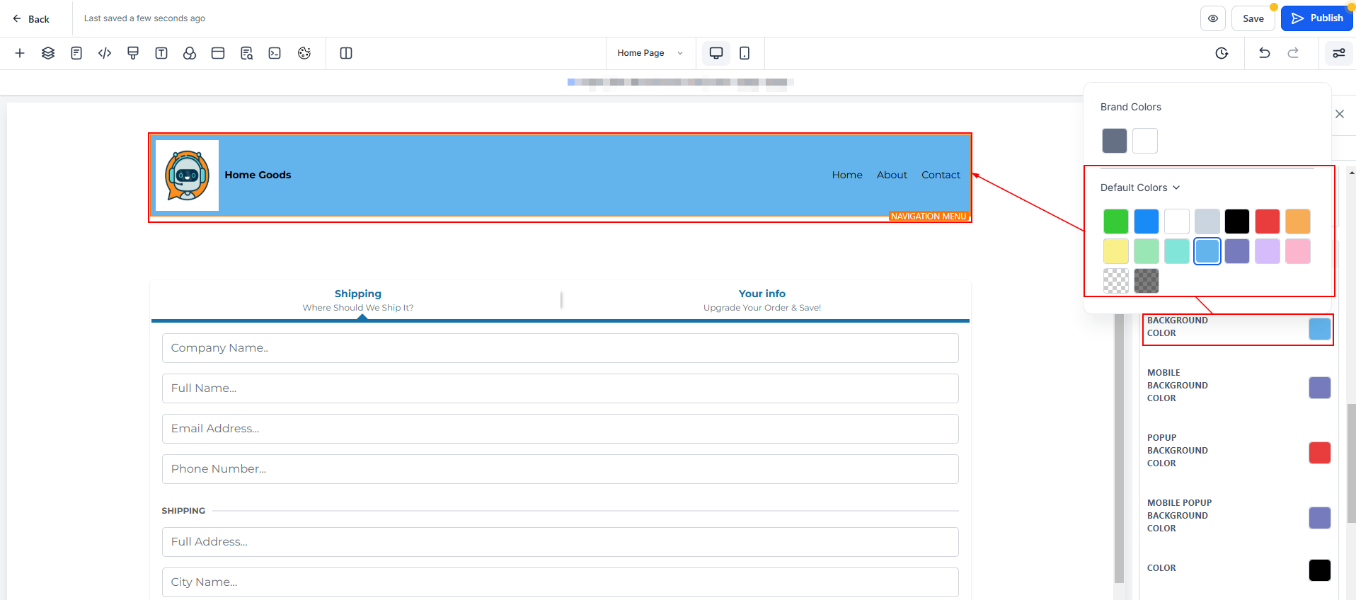 - Background Color: Allows you to change the background color of your navigation bar or section for desktop view. You can select a color from the palette.