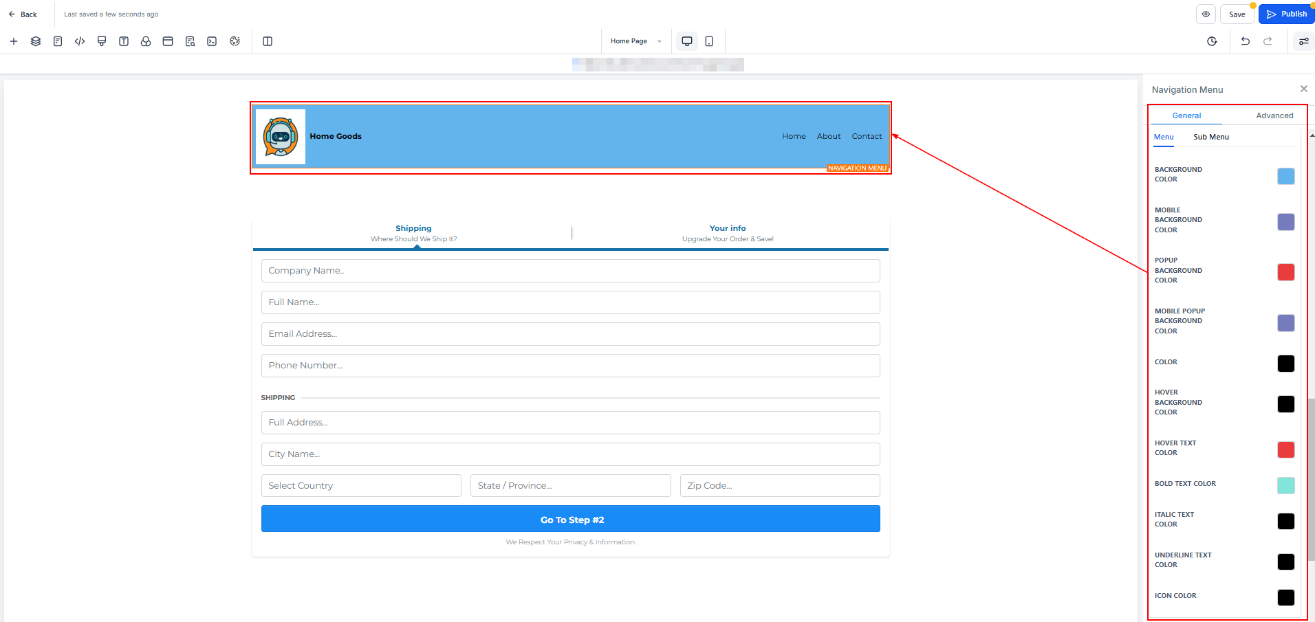 The navigation menu element will add a navigation menu to the top of your funnel page. This is useful for linking to different sections of the page or linking to other pages in your funnel. When you add the navigation menu element, you will have editing options on the left-hand side.