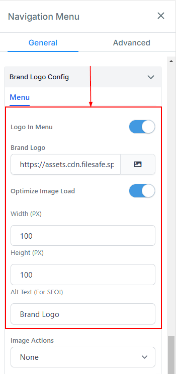 - Width and Height: In this Width and Height section, you can adjust the width and height of your brand logo to the desired size to fit your menu. You may need to play around with different combinations of numbers to get the right fit.