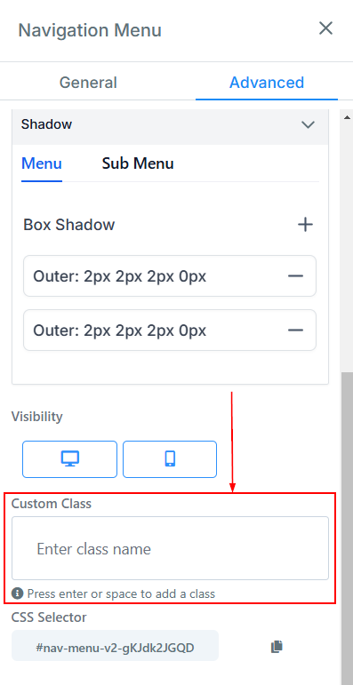 The Custom Class feature allows you to input your specific class to your content. Press enter or space to add a class.