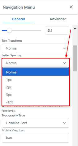 - Menu Item Spacing: In the Menu Item Spacing Options, you can adjust the spacing of your menu items. To do this, simply move the bar to increase the number until you achieve the desired spacing. You can also input a desired number into the box to ensure your element is spaced accordingly.