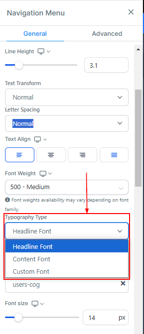 The Typography Type dropdown will give you options for the font of your navigation bar. You can choose to use the headline or content font that you set up in settings or choose a custom font. With the custom font option, you will then be able to select from a variety of fonts with an additional dropdown.