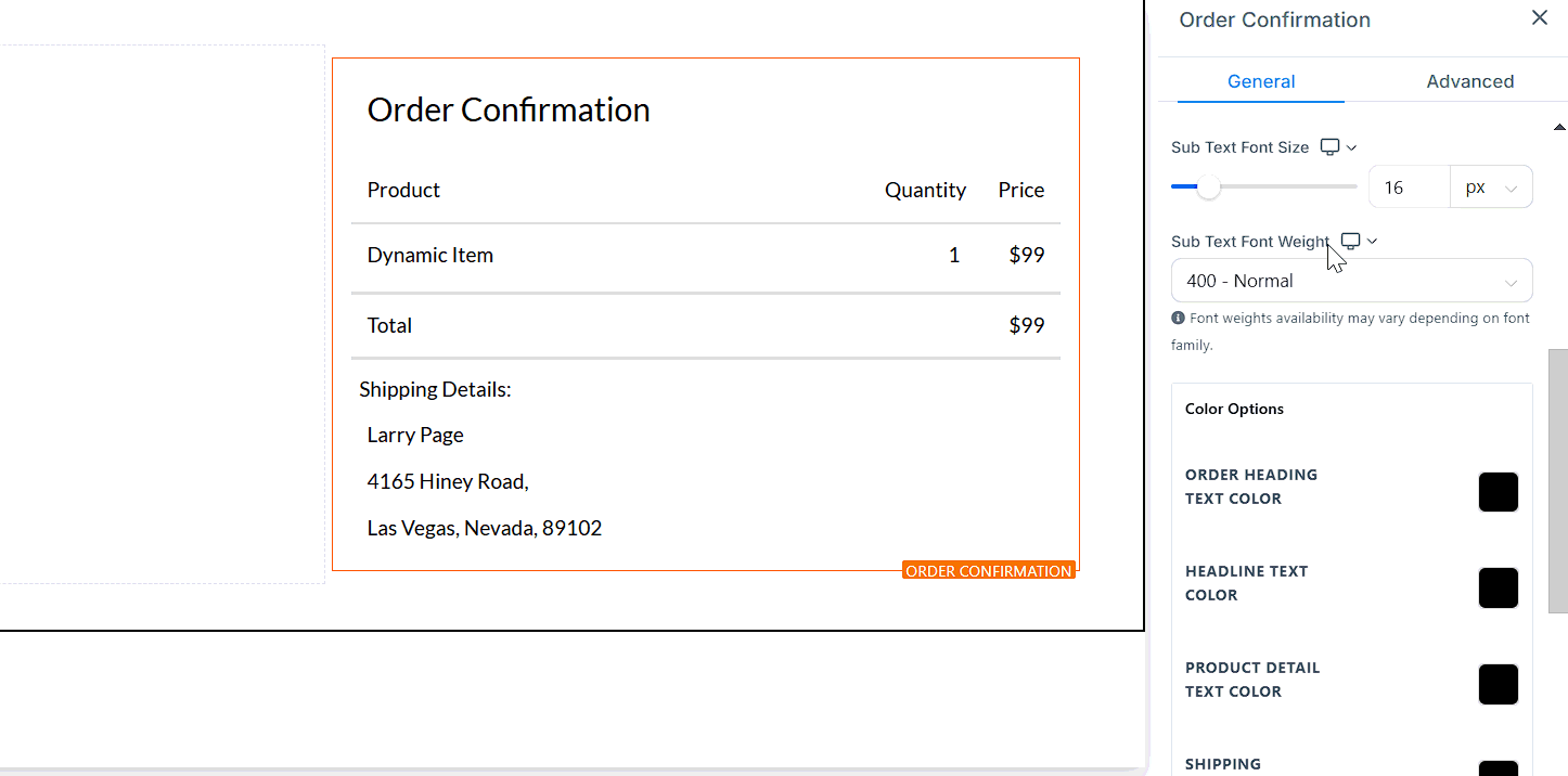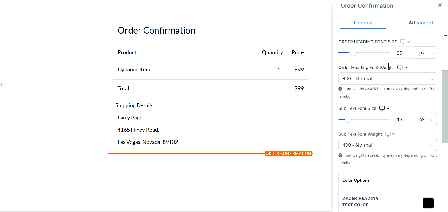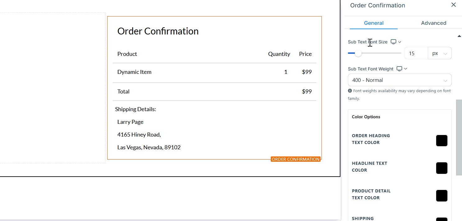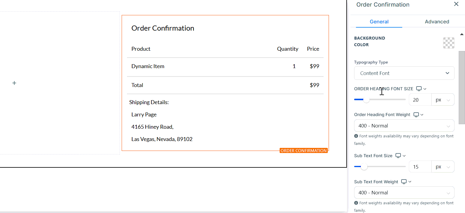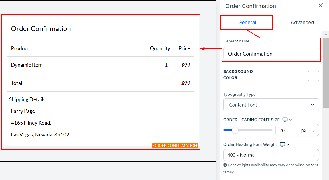 Customizing the Order Confirmation element gives you full control over how purchase details are displayed. With options to adjust fonts, colors, and layout, you can create a confirmation page that matches your brand while keeping it clear and easy for customers to review their orders.