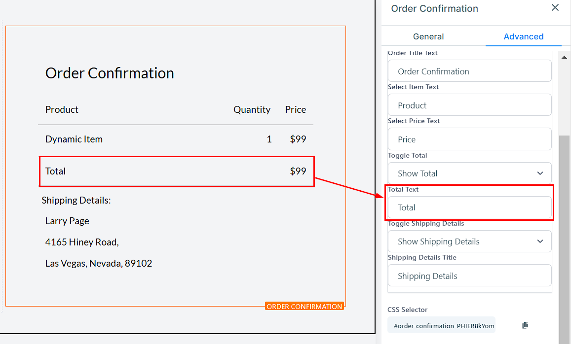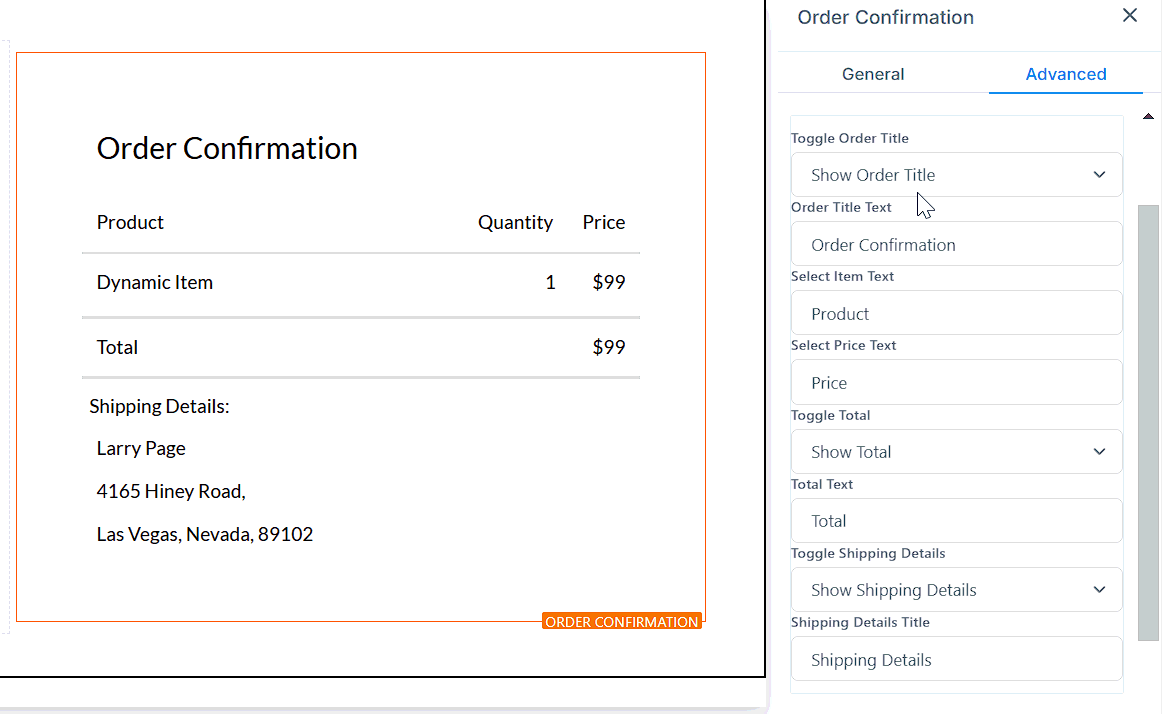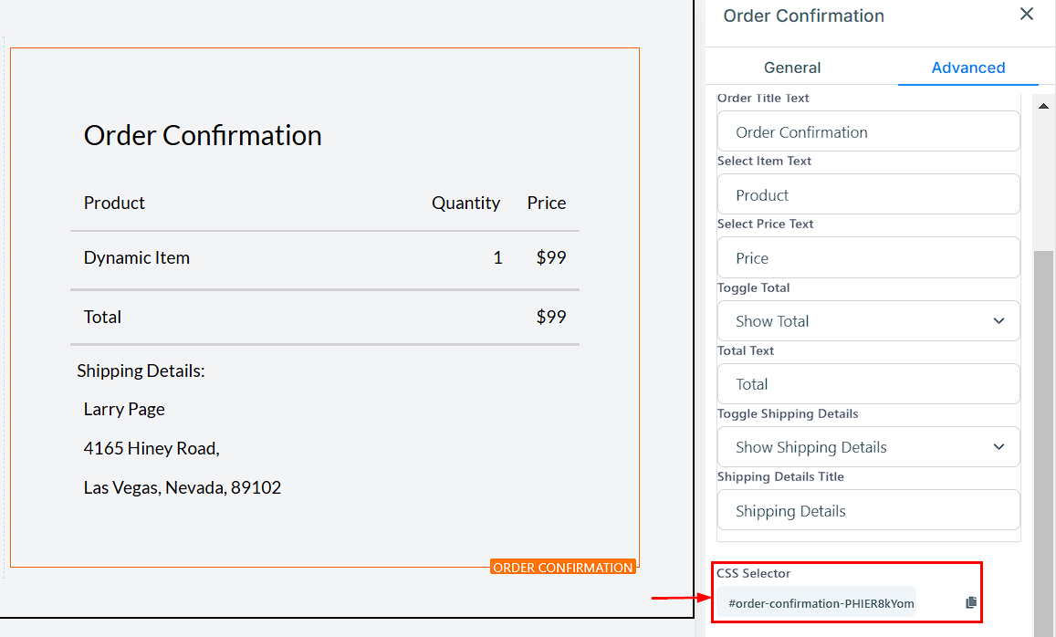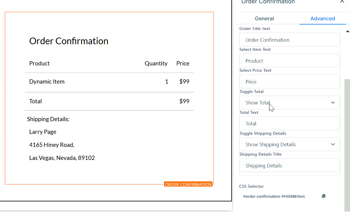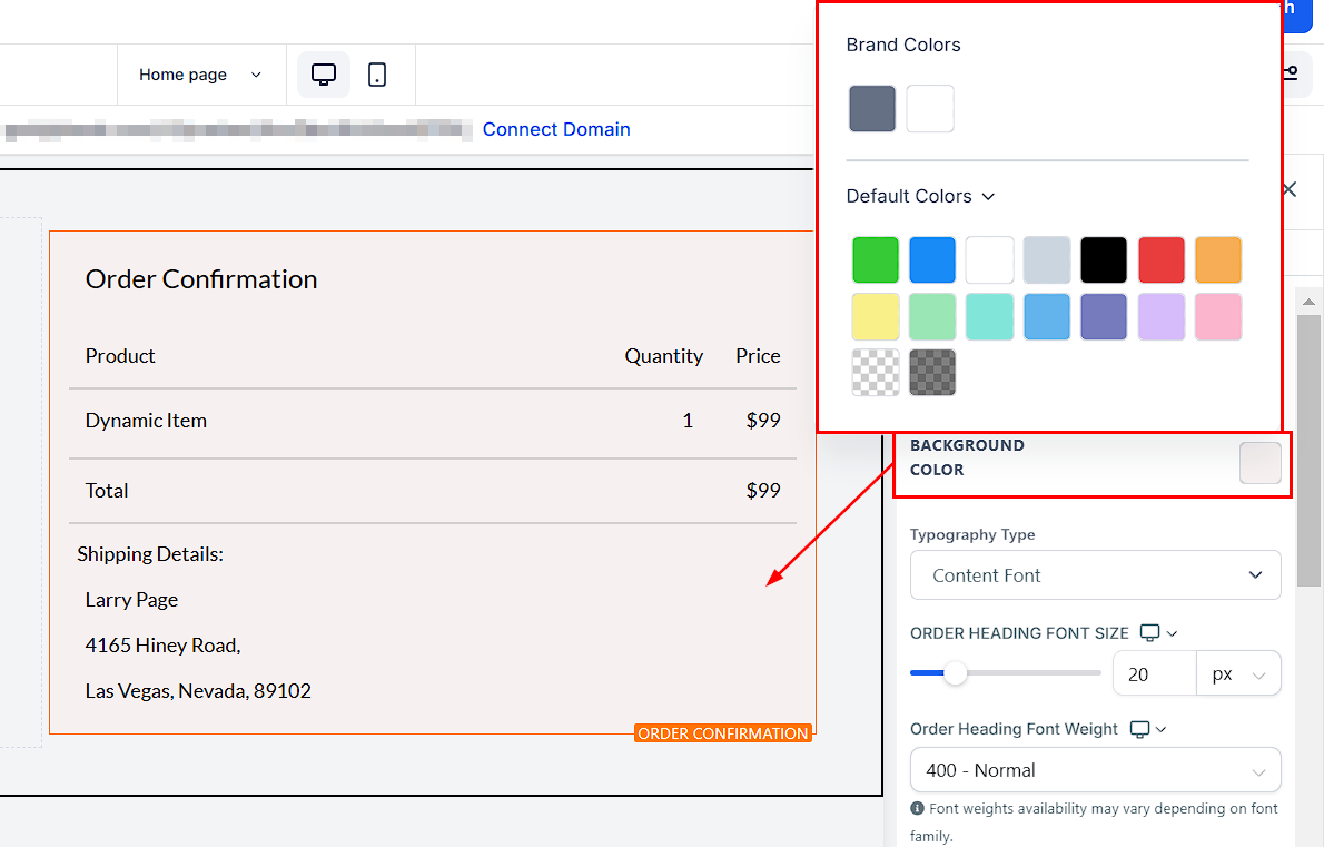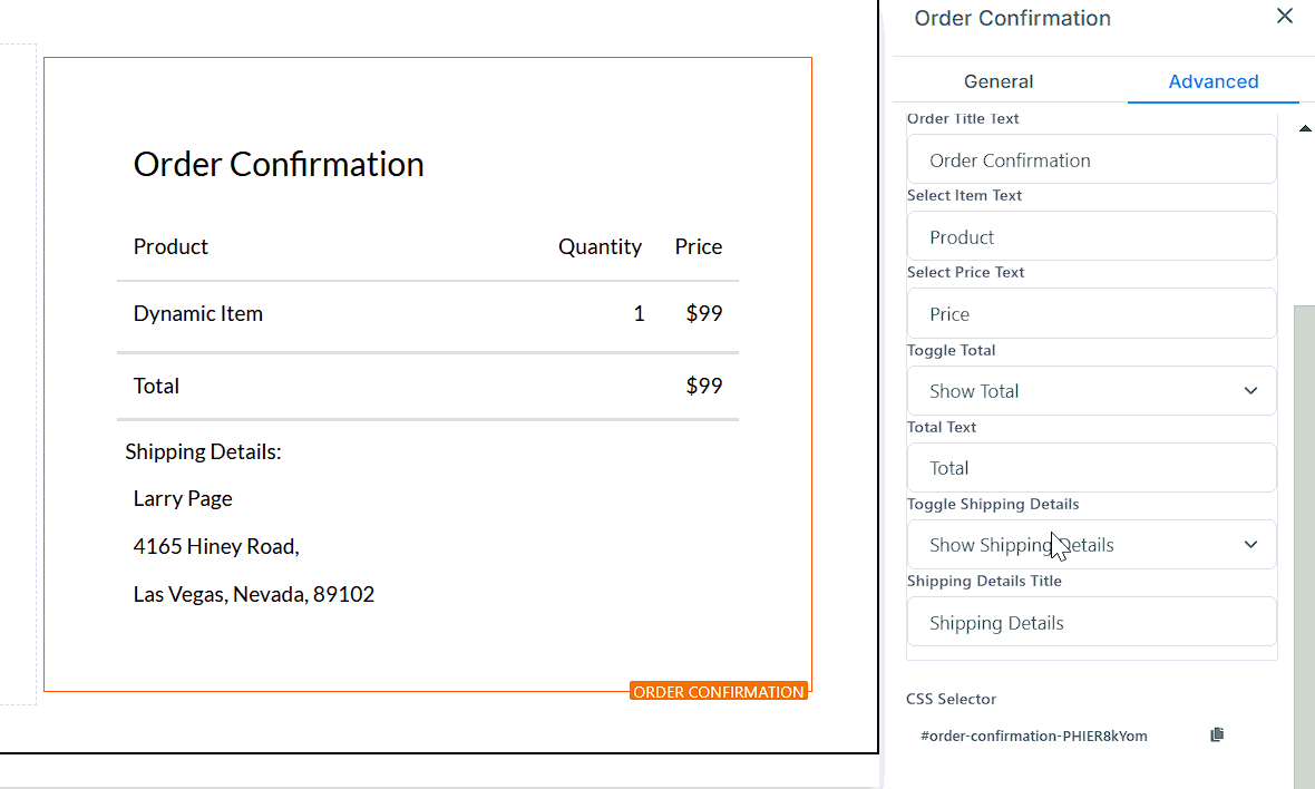 Customizing the Order Confirmation element gives you full control over how purchase details are displayed. With options to adjust fonts, colors, and layout, you can create a confirmation page that matches your brand while keeping it clear and easy for customers to review their orders.