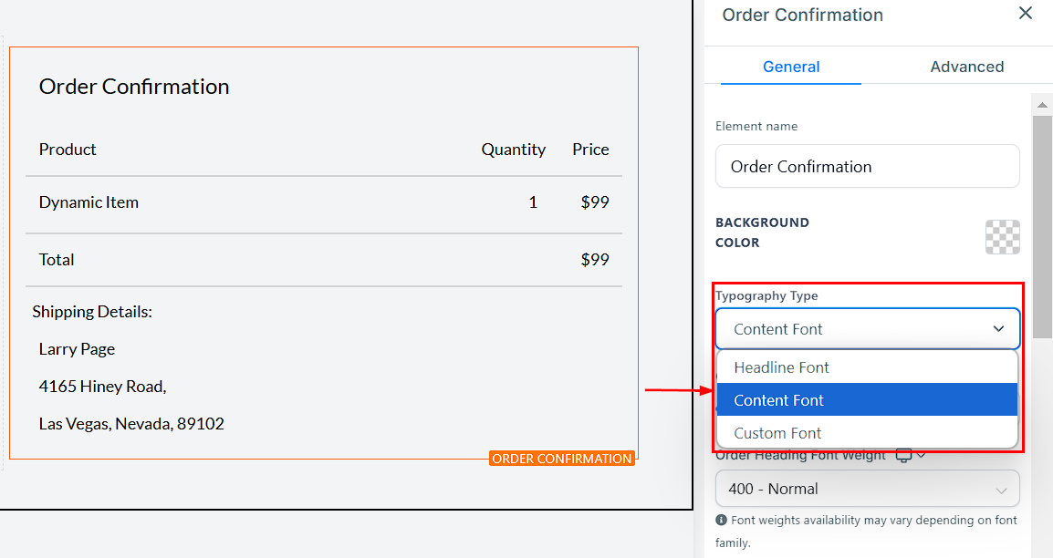The Typography Type dropdown will allow you to select the font you would like to use for your order confirmation element. You can choose from the headline or content font you set up in settings or select the custom font. If selecting a custom font, you will be able to click Default Font and choose from a variety of different font options.