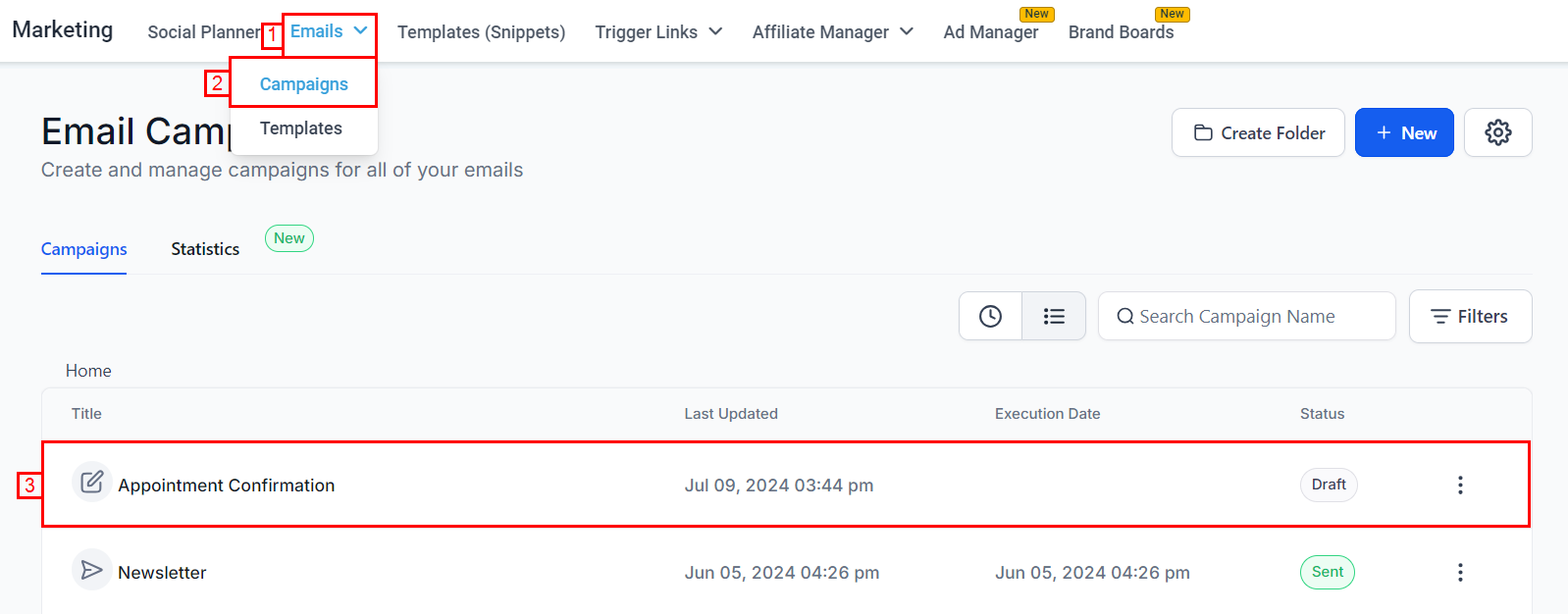- Navigate to the Email Marketing section and create a new campaign or select an existing campaign.