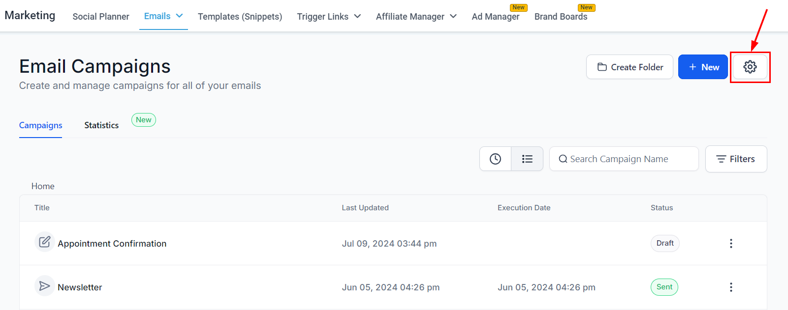 Additionally, email addresses can be verified through the Campaign settings page. Begin by selecting the gear icon from the Campaigns view.