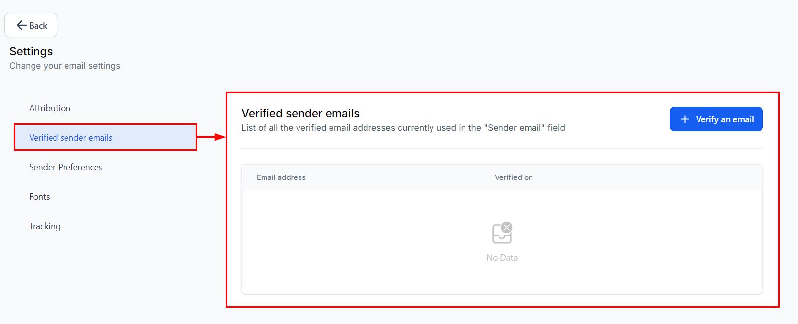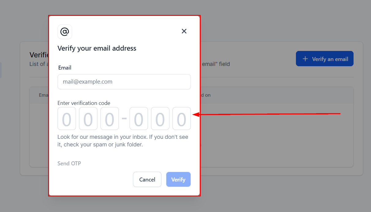 Click the "Verify an email" option within the Verify Sender emails section. This will prompt you to enter the email address followed by the OTP.
