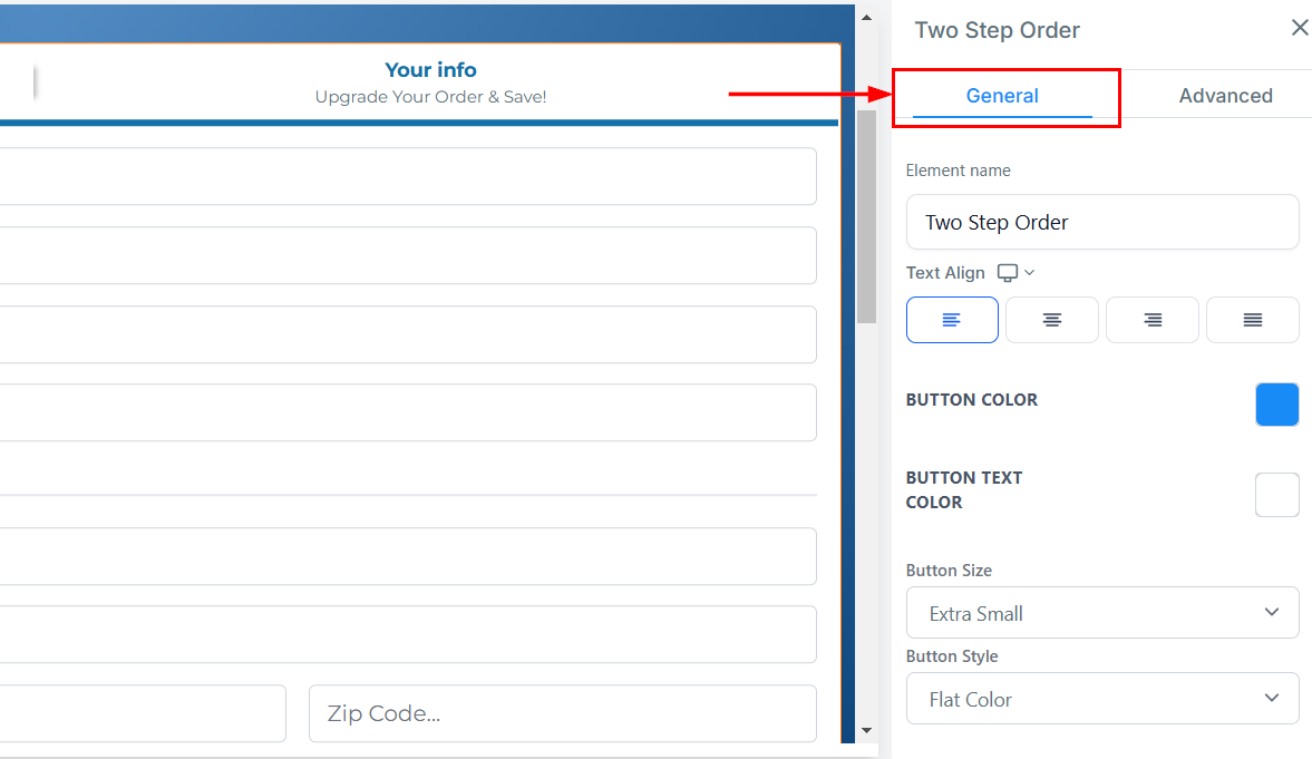 You can use the 2-Step Order Form to get your customer's contact information and shipping details. For this element, you will have the Shipping details and the information in two separate sections. Select the element to open its settings on the right-hand side of your builder.