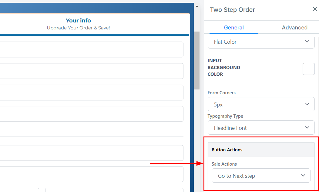 Under Button Actions, you have the option to choose between going to the next step, a website URL, or to another step within the funnel or website for Sale Actions.