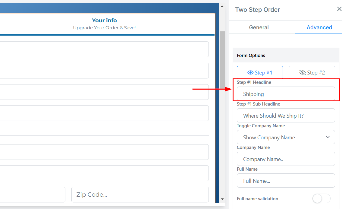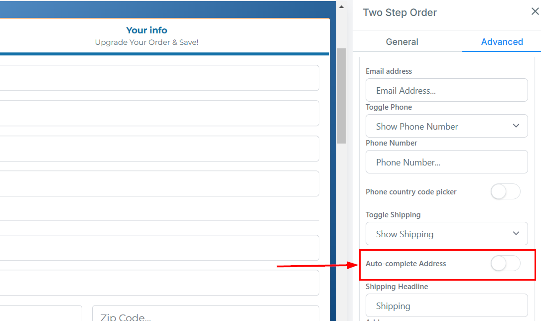 You can choose whether to display or hide the form field for Shipping info using the Toggle Shipping feature. If you have shipping info toggled on, you will have options for those fields.