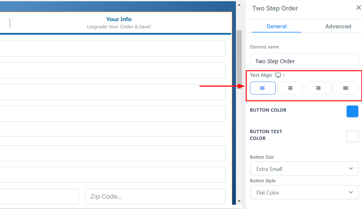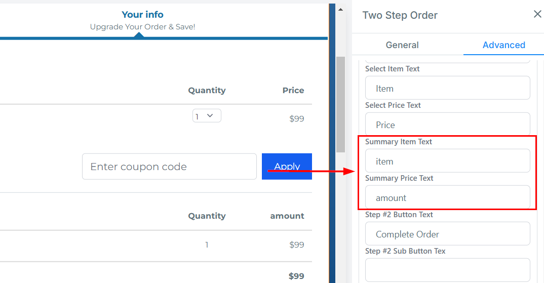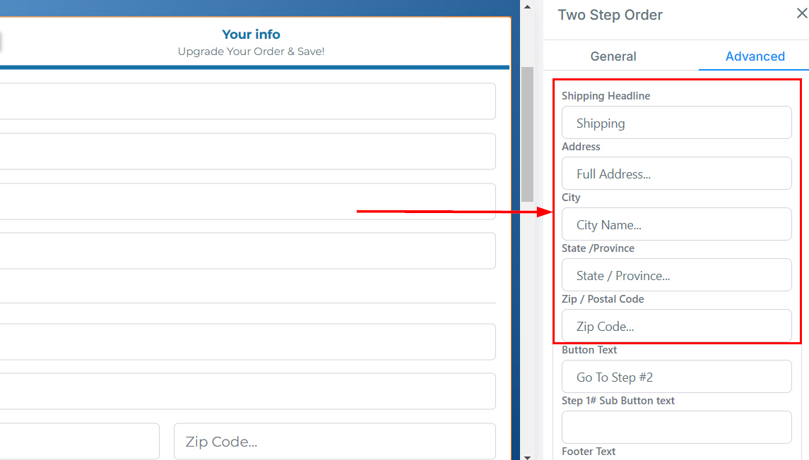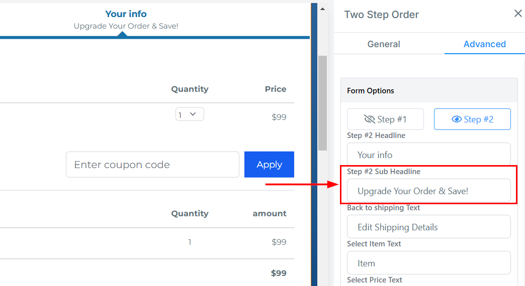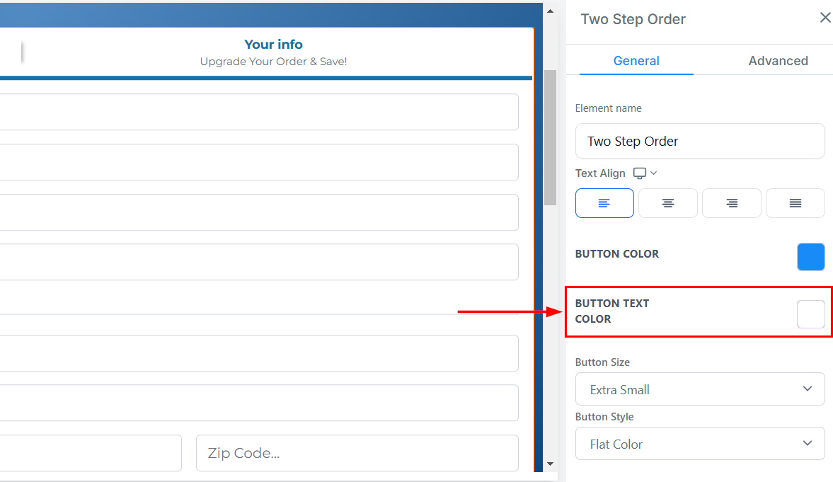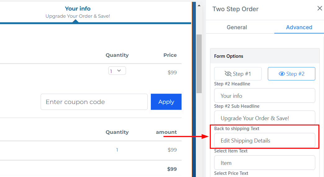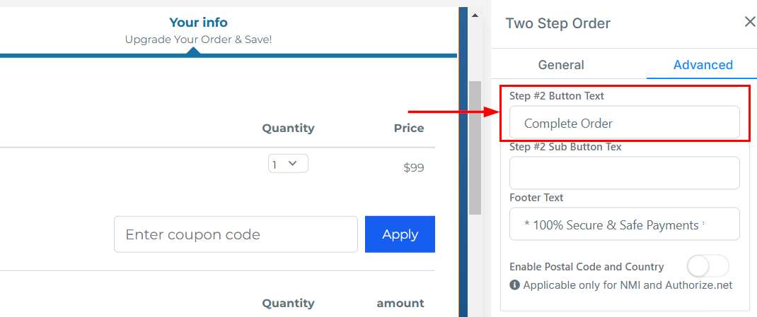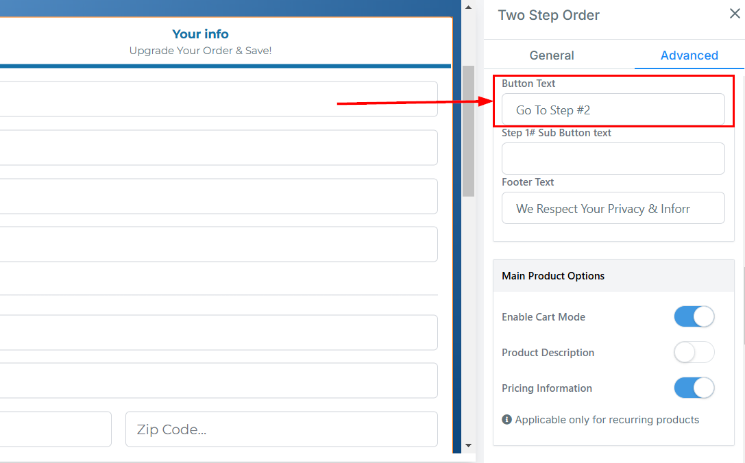 Under Button Text, you can customize the text displayed that allows customers to navigate to Step 2 of the order form.