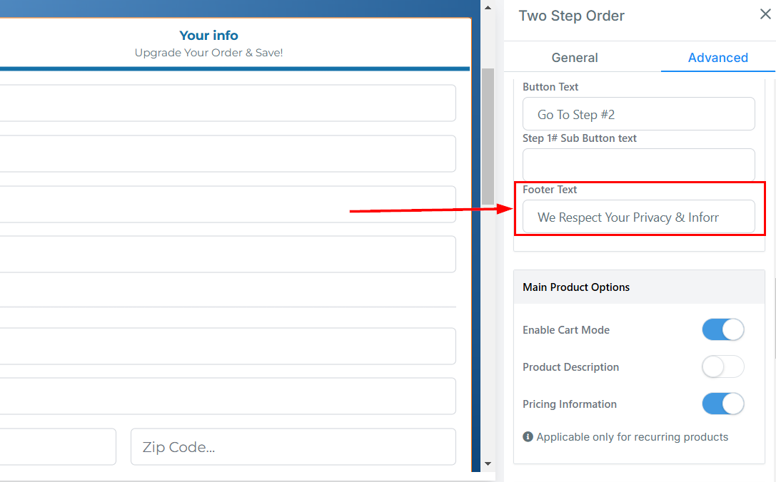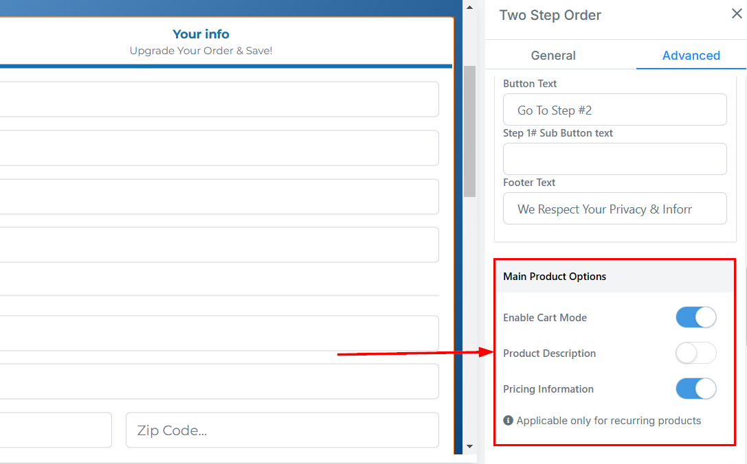 - Pricing Information: Display the recurring and trial information by enabling this setting. This toggle is enabled for new funnels.