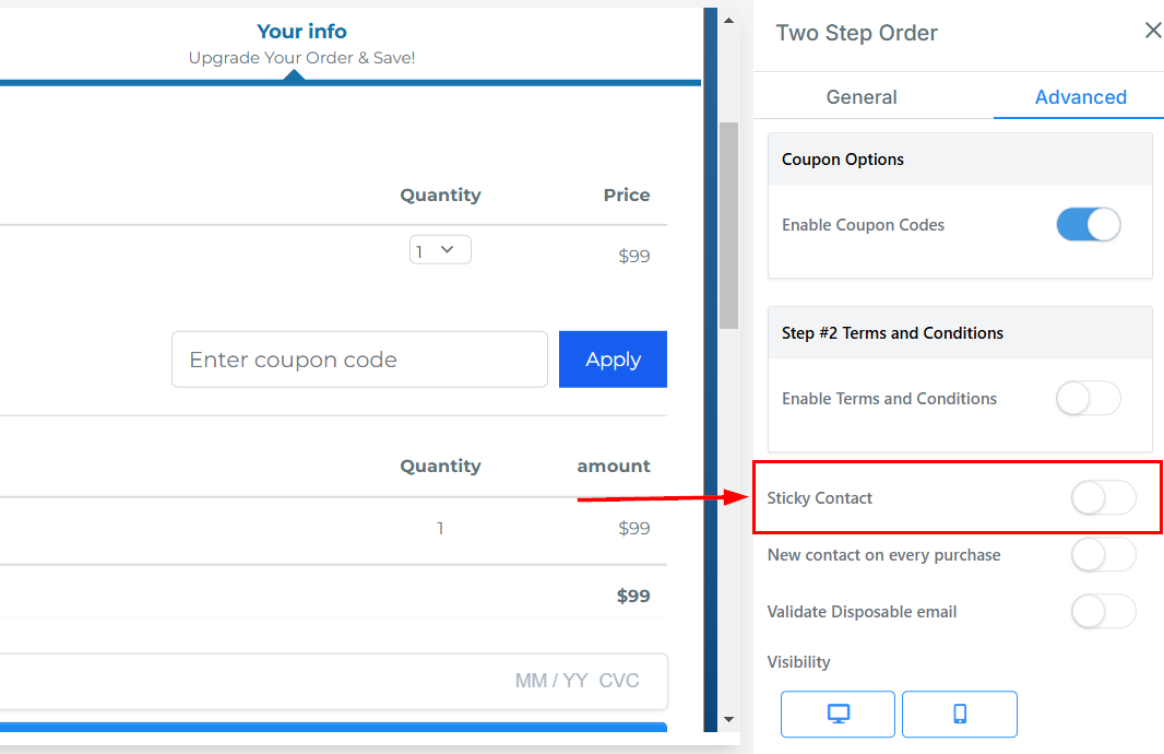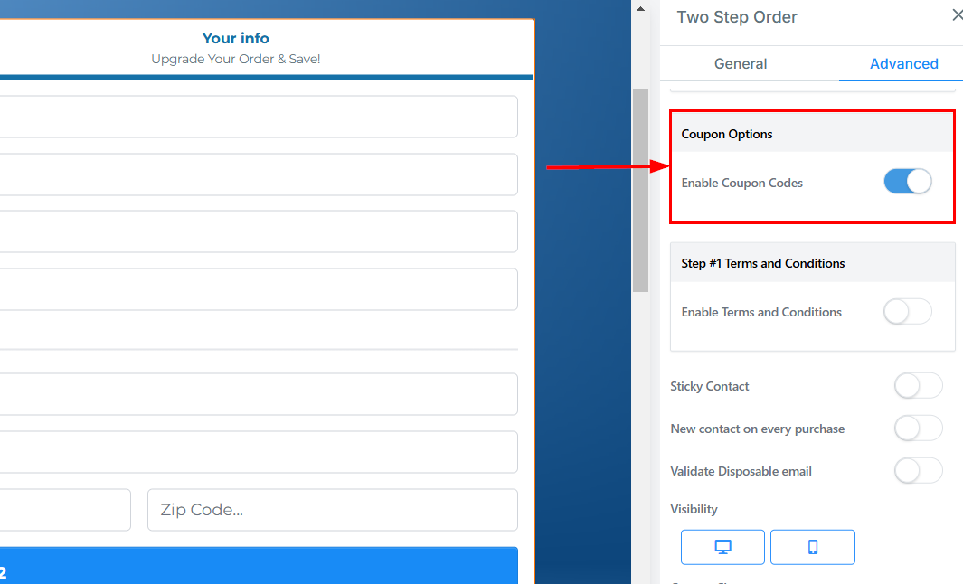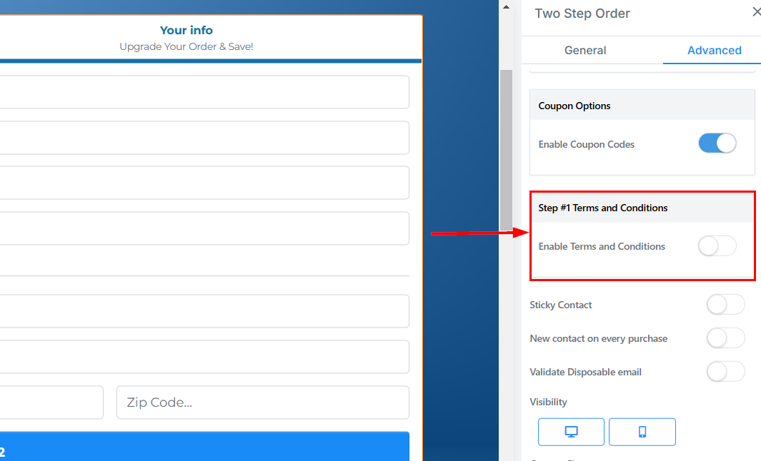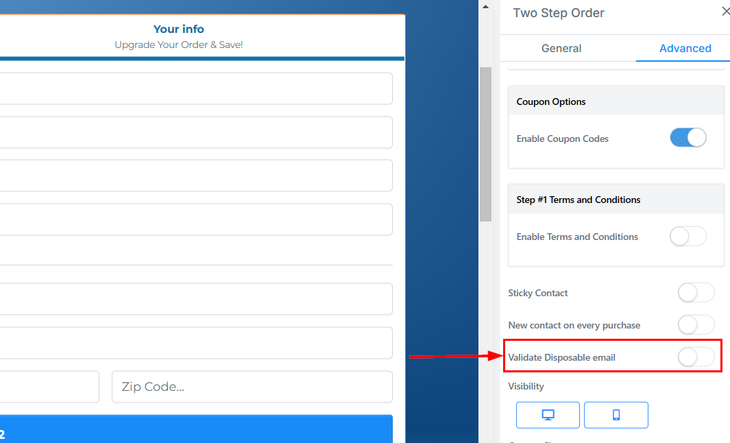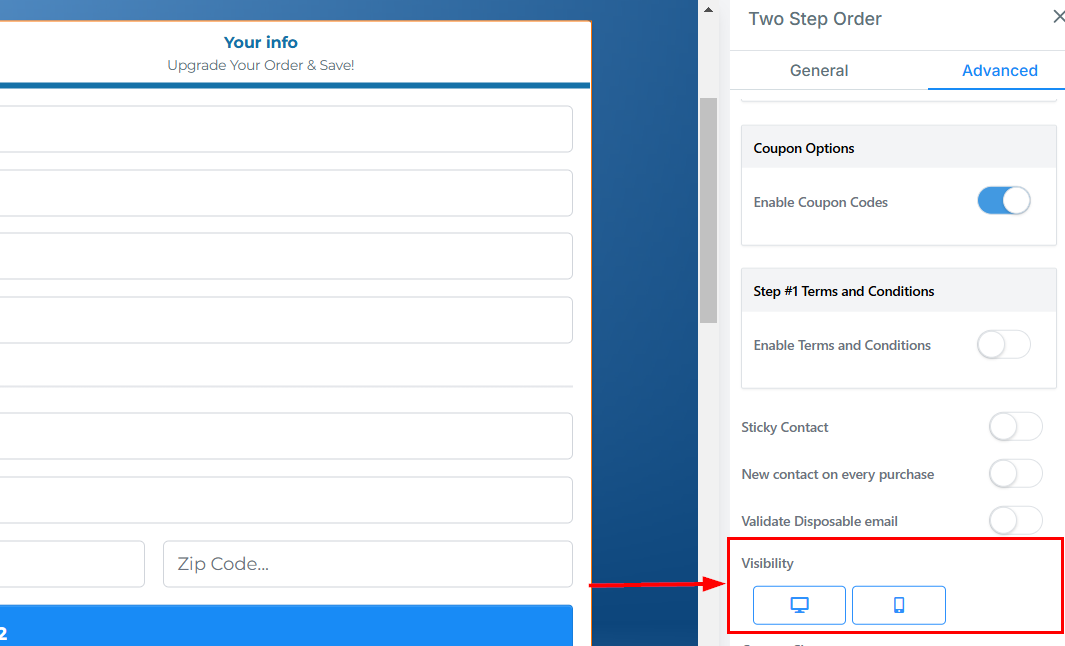 You can decide if you want the order form to be visible on only mobile devices, desktops, or both by clicking on it to highlight the icon.