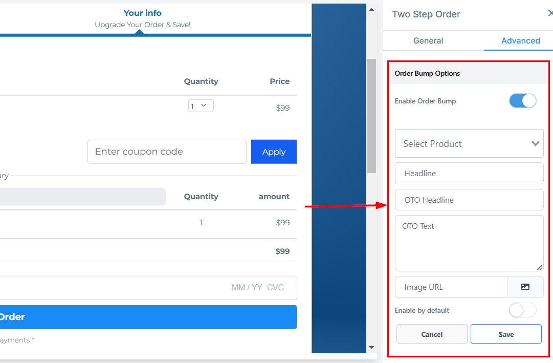 - Enable by default: "Enable by default" allows you to set the order bumps to turn on by default.