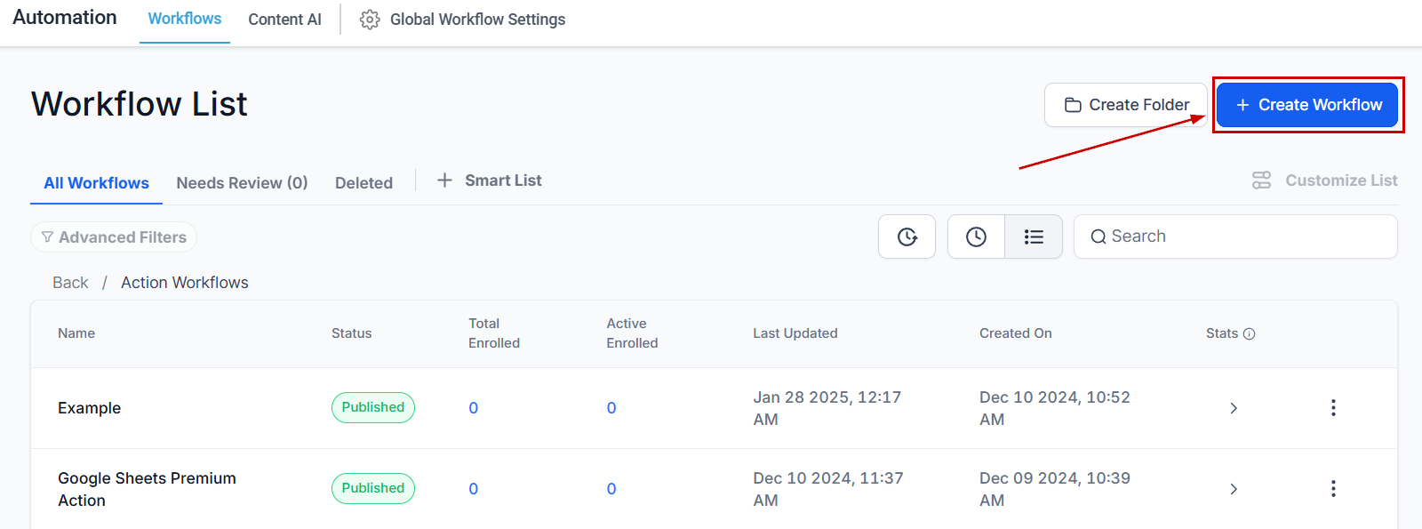 Go to the Workflows tab inside the Automation section and create a new workflow.