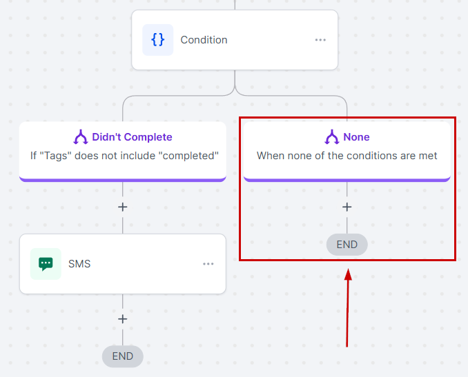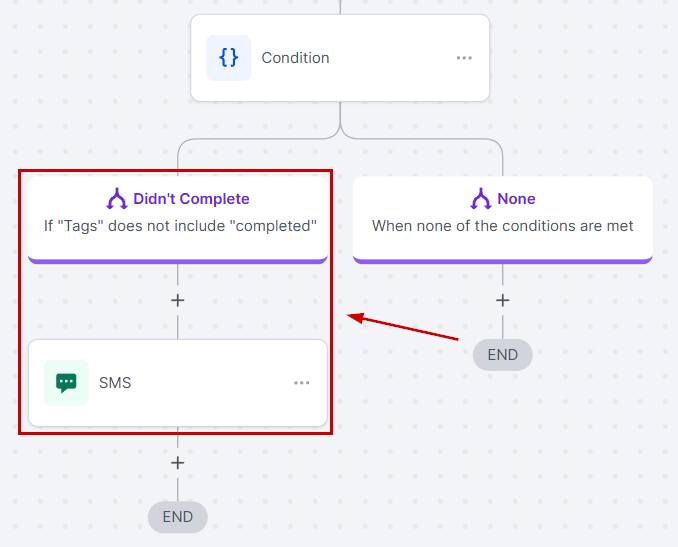 Add an “If/Else” Conditional action to check if the lead has the completion tag.