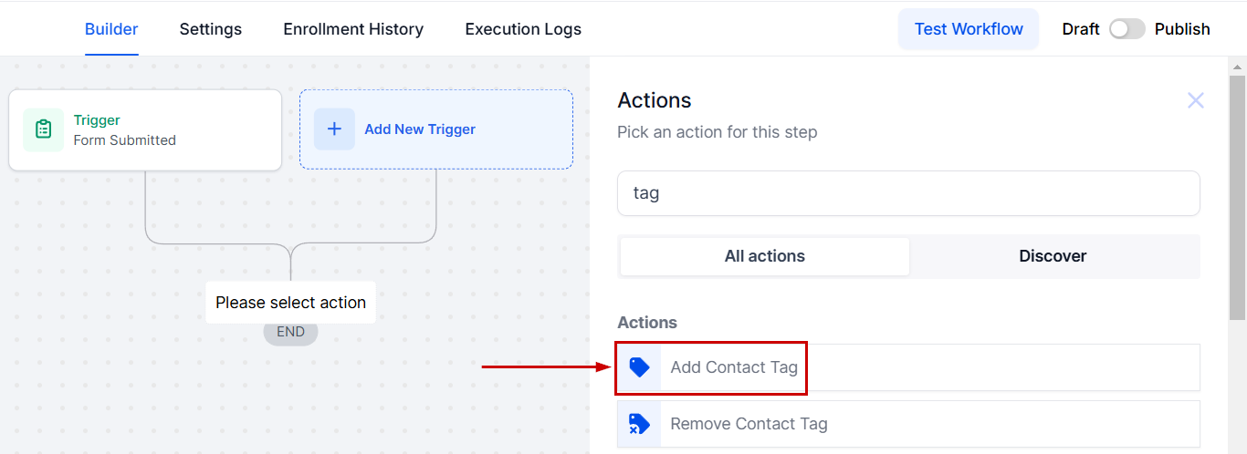 Now, you'll need to create a secondary workflow to assign them a Completion Tag or other identifier. This simple workflow will have the action as the Trigger, for this example, we'll use Form Submitted.