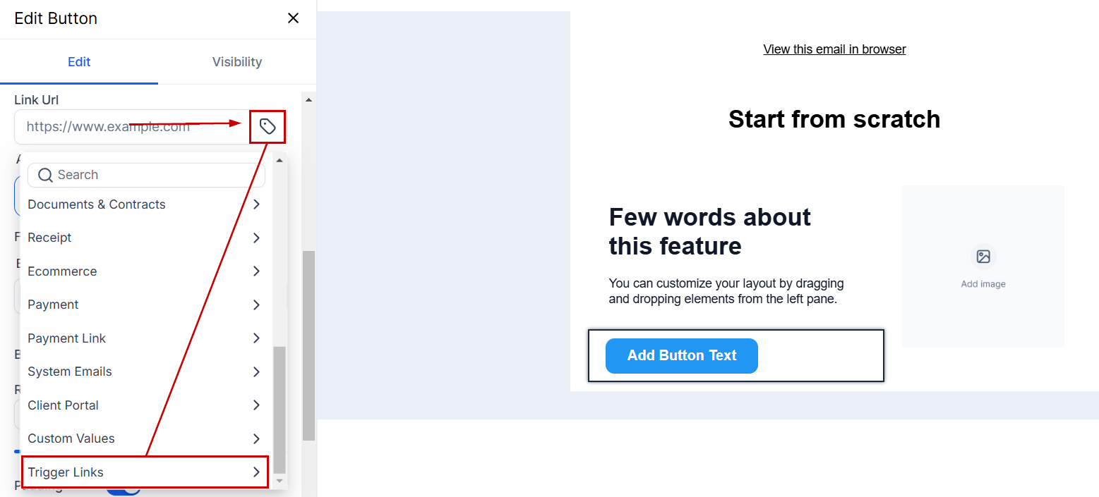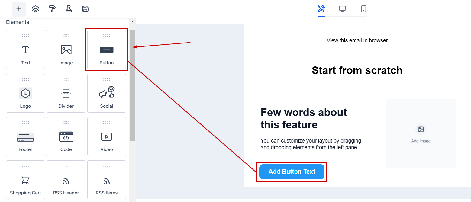 To ensure the effectiveness of your trigger links, you must incorporate them into your marketing campaigns. First, let's check how to use them inside your email builder. To start, add a button element to your email template.
