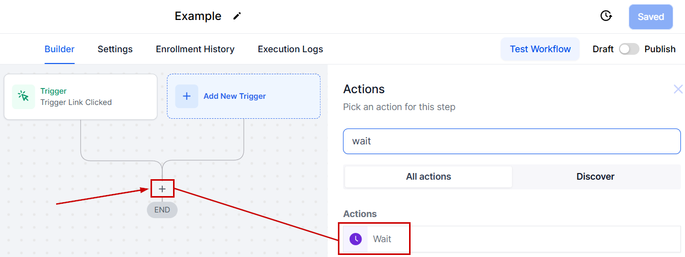 For trigger links that prompt customers to complete an action, such as filling out a form, click the plus sign button to add a Wait action.