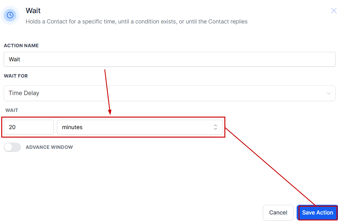 Decide on a waiting period (e.g., 20 minutes) to give leads time to complete the action then click Save action.