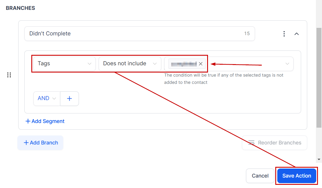 To create the condition select “Tag” as your filter, “Does not include” as your operator, and enter the tag you'll be using for customers who completed the action, then click Save action.