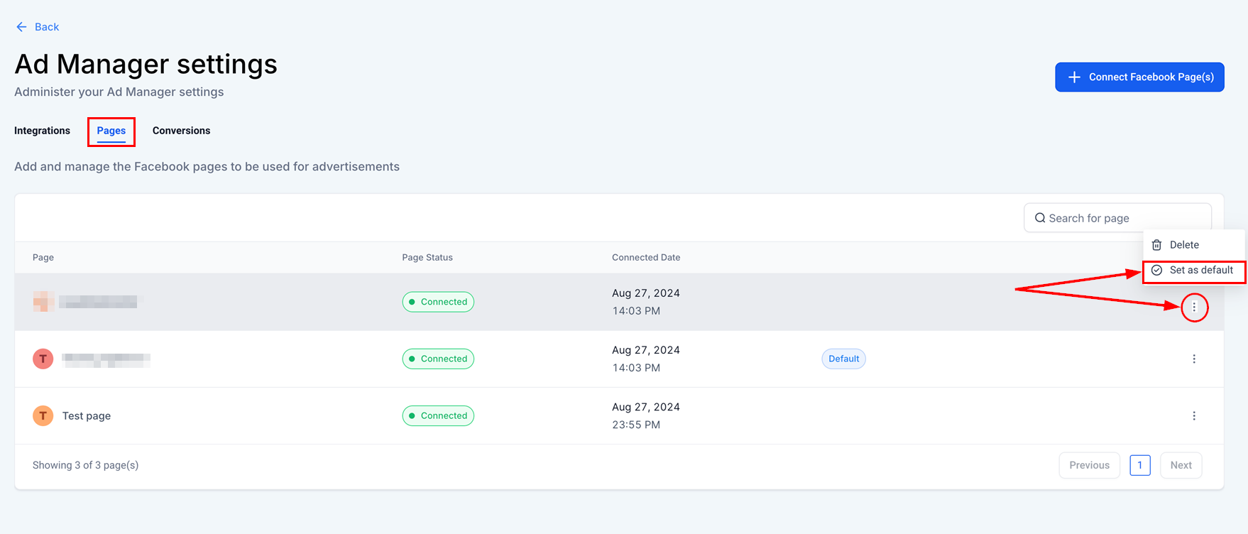 - During the onboarding process, the first Facebook page connected to Ad Manager will automatically be set as the default.