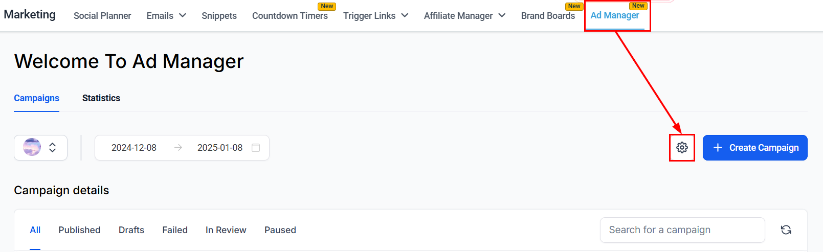To access the Ad Manager settings, simply click the settings icon on the Ad Manager home page, as highlighted in the screenshot below.