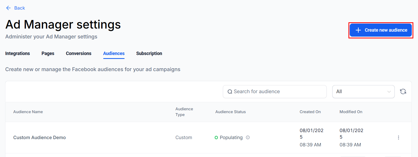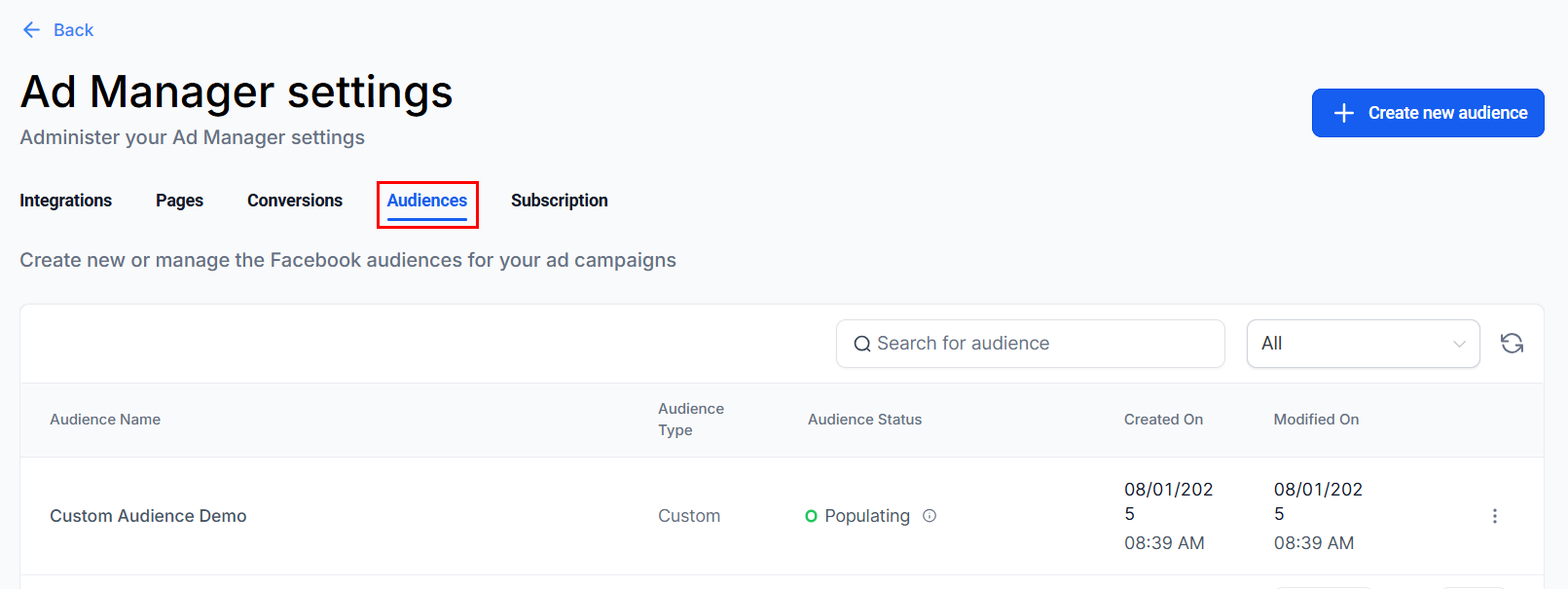 Upon selecting the Audiences tab, you can view a comprehensive list of all audiences created within Ad Manager, as well as those previously created on the Meta platform and imported from the connected ad account.