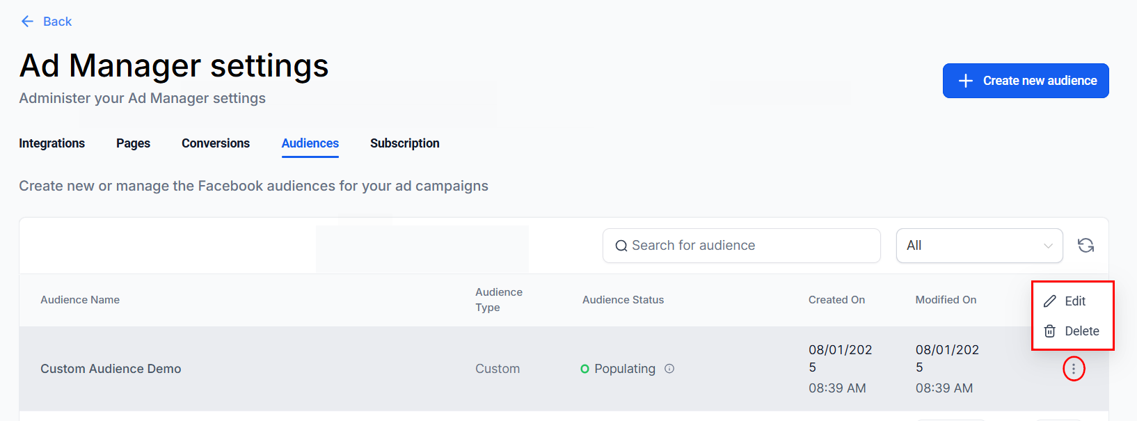 Edit the name and description of an existing audience by clicking the ellipsis icon next to the audience and selecting Edit. To delete an audience, click the Delete button, which will remove it from all draft and paused campaigns, provided the audience is not linked to any active campaigns. If an attempt is made to delete an audience associated with one or more active campaigns, a validation message will appear, notifying the user that the audience cannot be deleted as it is part of an active campaign.