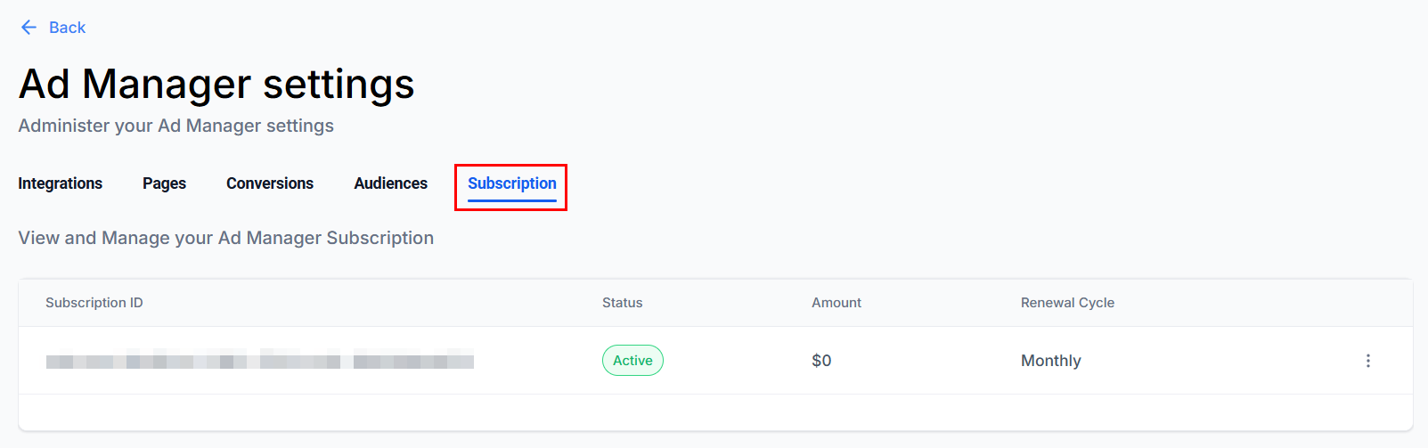 Use this tab to access and manage all aspects of your Ad Manager subscription. This includes viewing your current subscription plan, checking billing information, and canceling your plan.