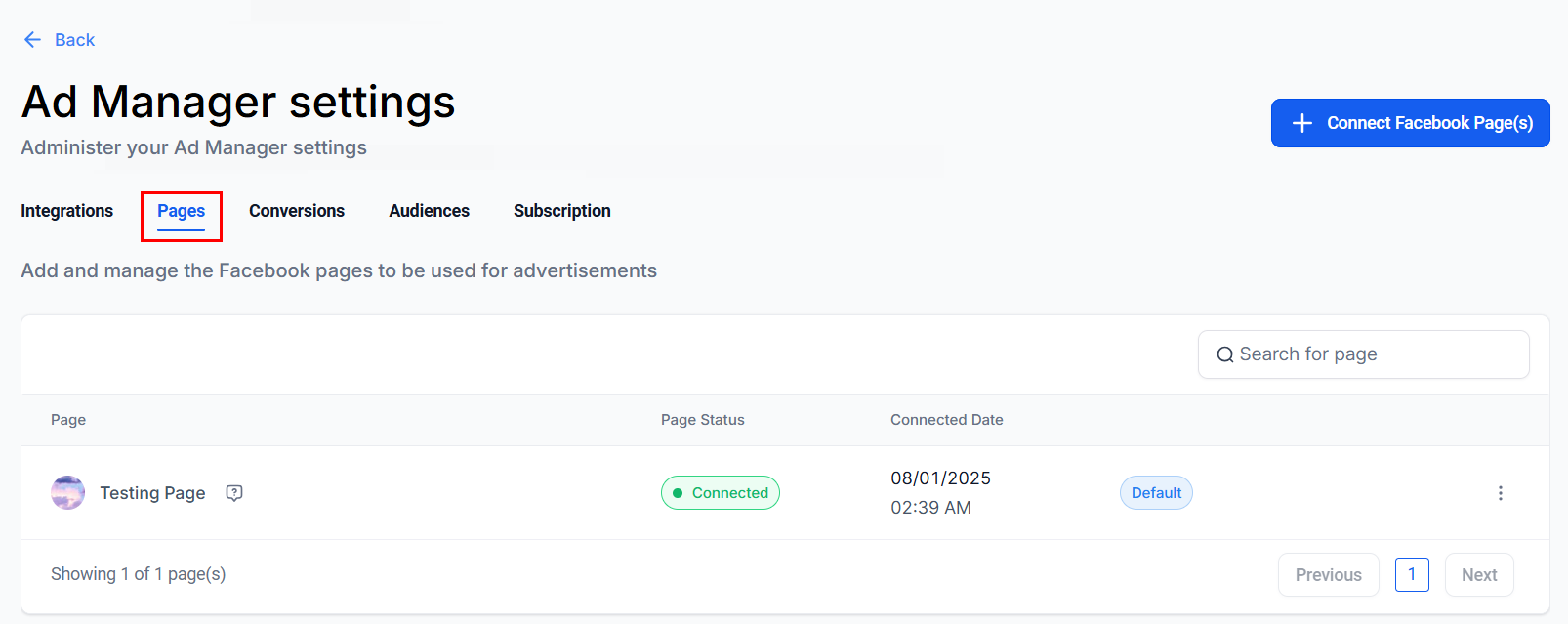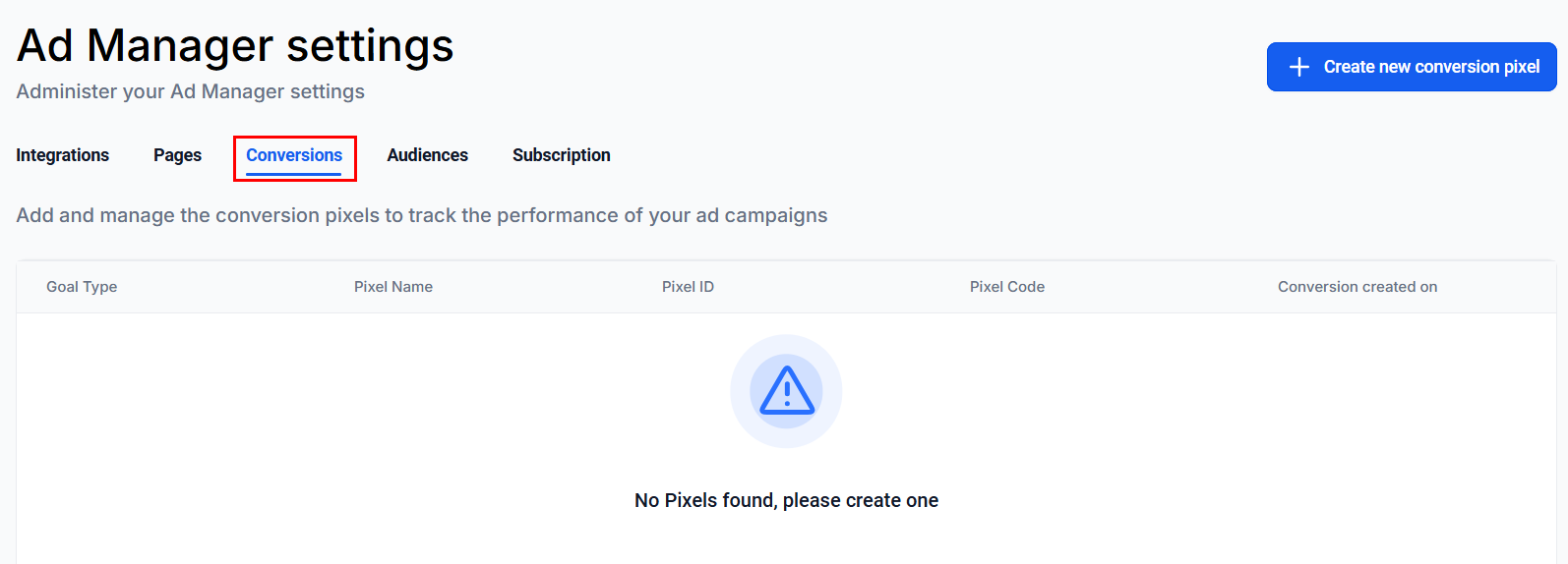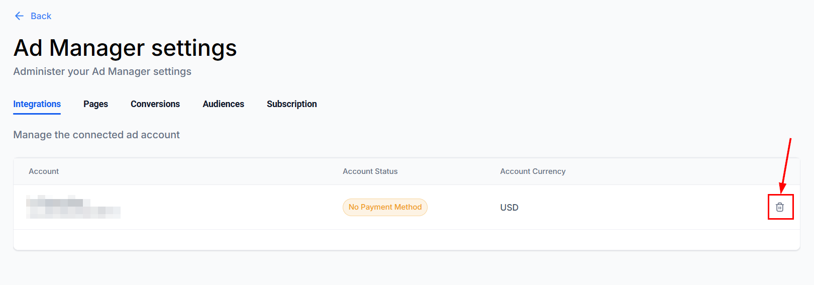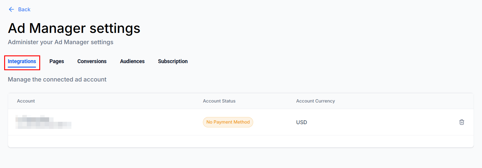 The Ad Manager settings section has five tabs: 'Integrations,' ‘Pages,’ ‘Conversions’, ‘Audiences’, and ‘Subscription’. Each tab serves a distinct purpose, offering essential tools and information for managing your ad campaigns. It is important to note that these settings remain consistent across all accounts, except the Integrations tab, which is not available in the Default Ad Manager, as this does not require an ad account connection. This article will explore the critical importance of Ad Manager settings and the various operations you can perform within this section. Understanding these settings is essential for effectively managing your ad campaigns and ensuring optimal performance.