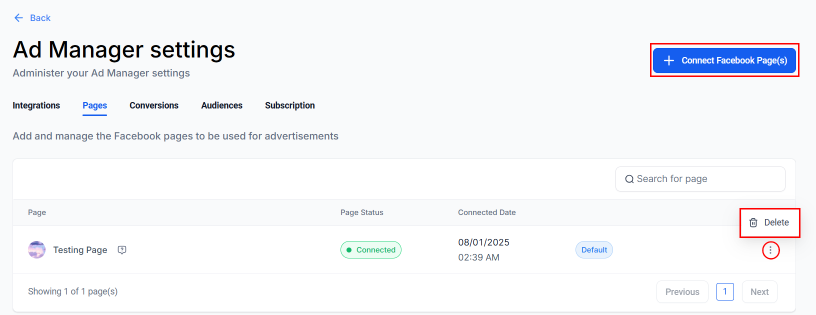 When deleting a connected Facebook page, you will be prompted with a confirmation that the action cannot be undone. Once confirmed, the selected page will be unlinked from Ad Manager, and no future ads can be published on that page through Ad Manager. However, previously published ads will remain on Facebook but cannot be managed by Ad Manager.