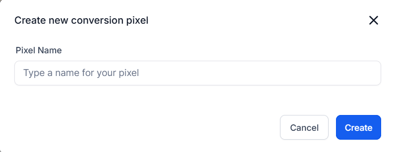 Clicking the "Create new conversion pixel" button opens a dialog where users can name the pixel. The pixel ID and code are automatically generated for easy use when creating workflows to send CAPI events back to Facebook.