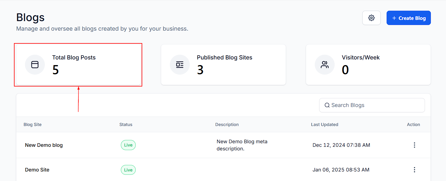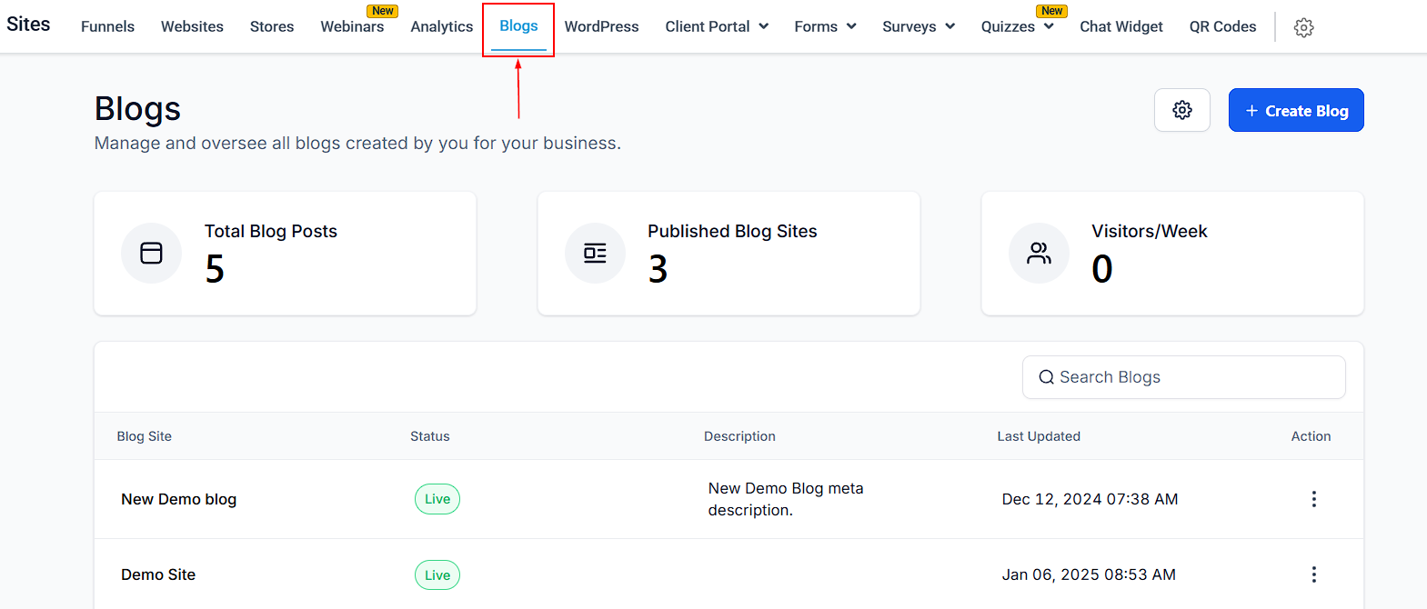 To start managing your blogs, navigate to the Sites tab and select Blogs. This will take you to the Blogs Dashboard.