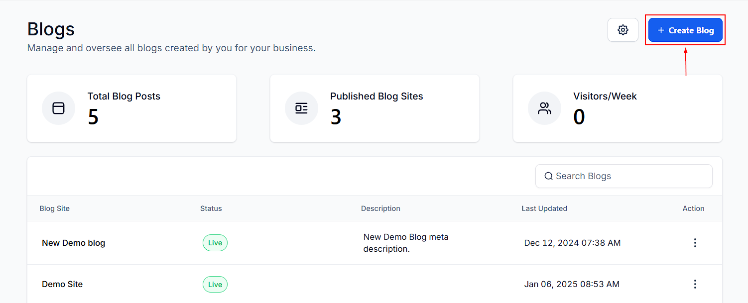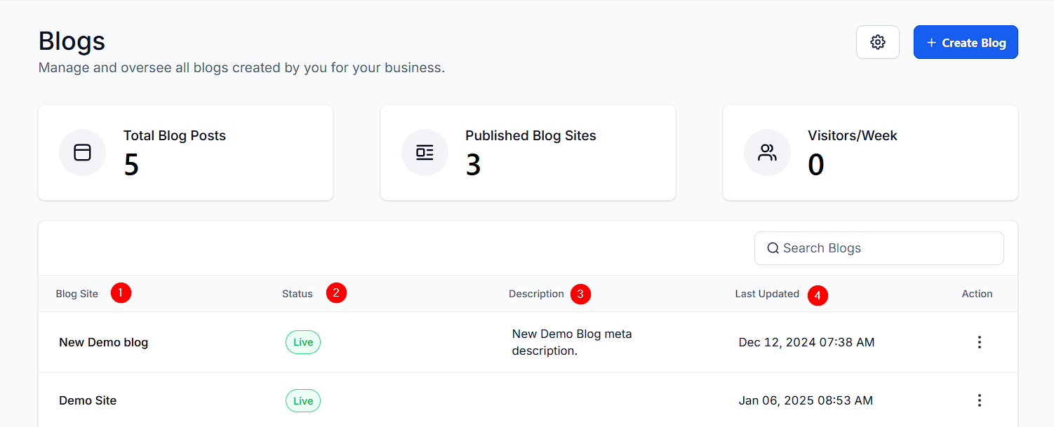 - Status: Indicates whether the blog is Live or in Draft mode.
