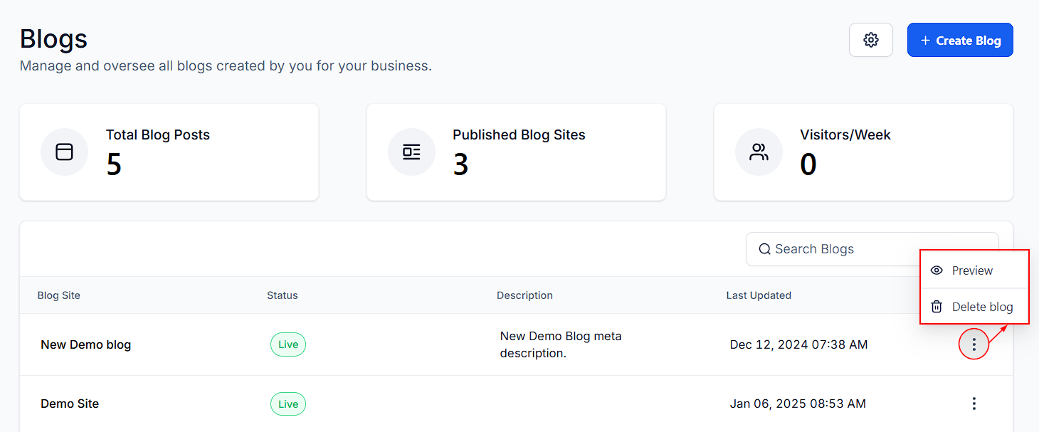 By clicking on the three dots under Action you can Preview or Delete the blog