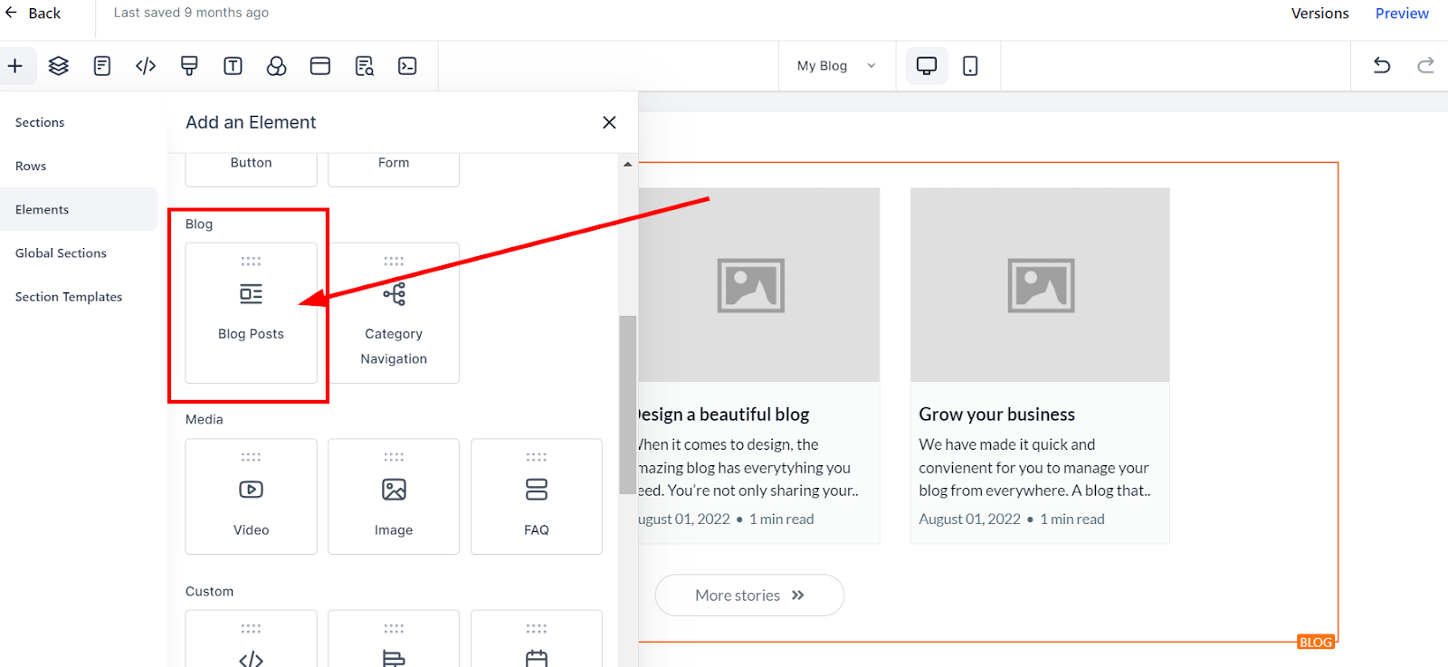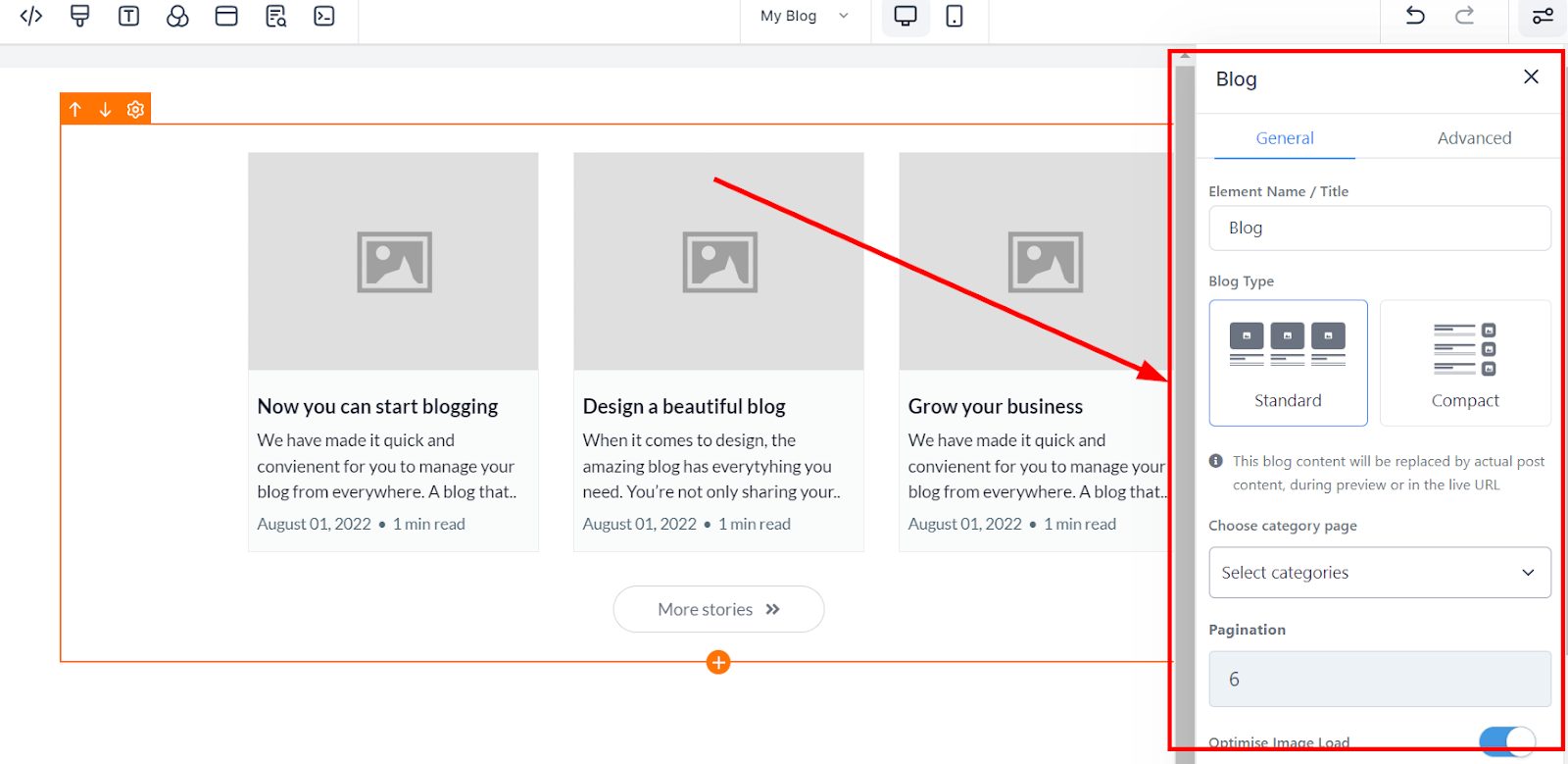Once inside, select the Blog Post element and customize it according to specific requirements. There are a couple of settings one can opt for – Blog type to choose between standard or compact columns, Pagination settings to choose the number of posts displayed on the screen, as well as several options for customizing button text such as renaming the More stories button.