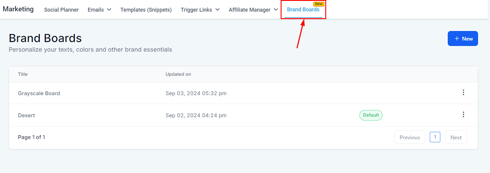 The current default brand board will be marked with a "Default" label displayed prominently in its row.