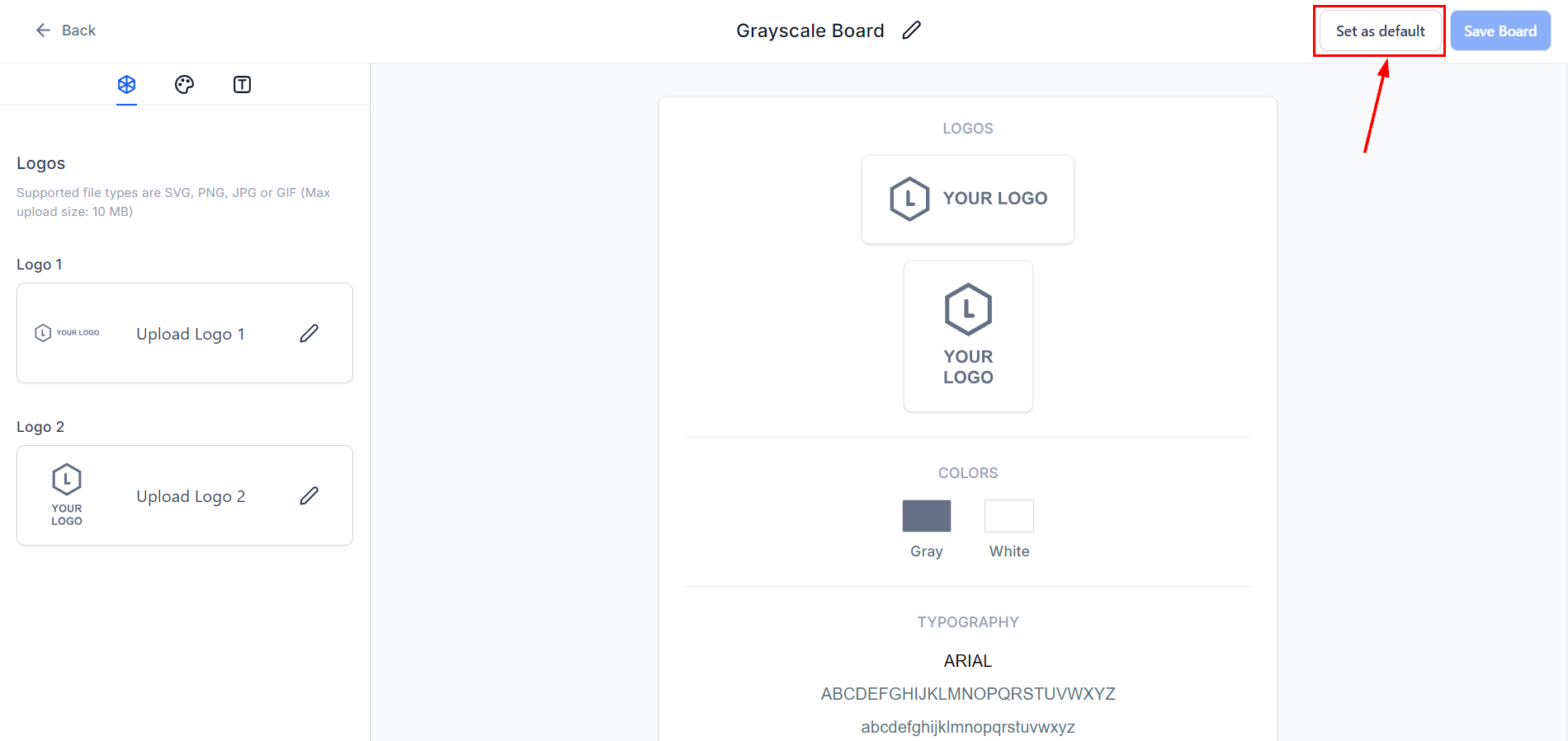 - Updated Guidelines: Update the default board when there are significant changes to your brand guidelines, such as new colors, logos, or other key elements, to ensure all materials and communications align with the latest branding.