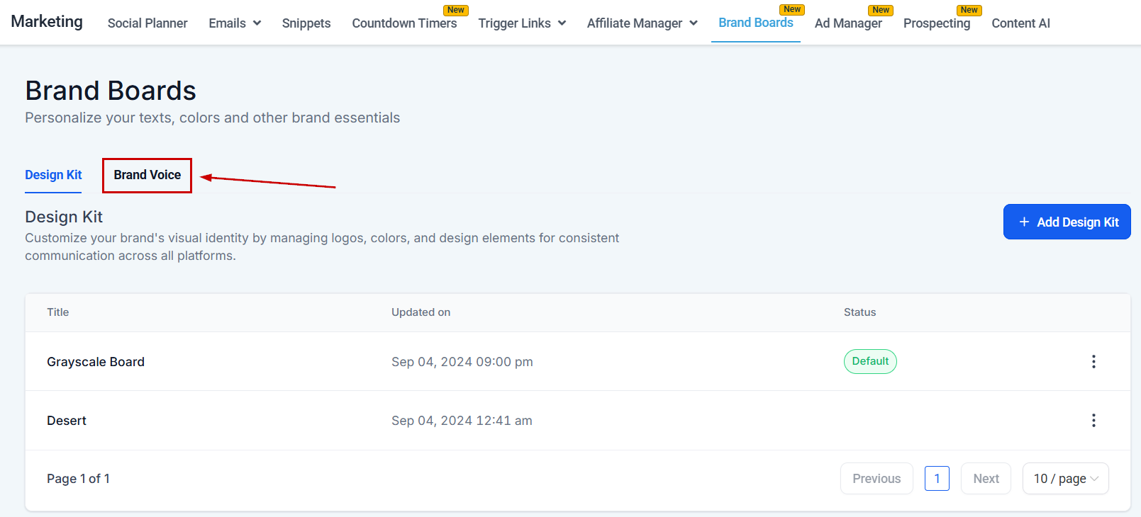 Head to the Brand Boards tab inside the Marketing section and switch to the Brand Voice tab.