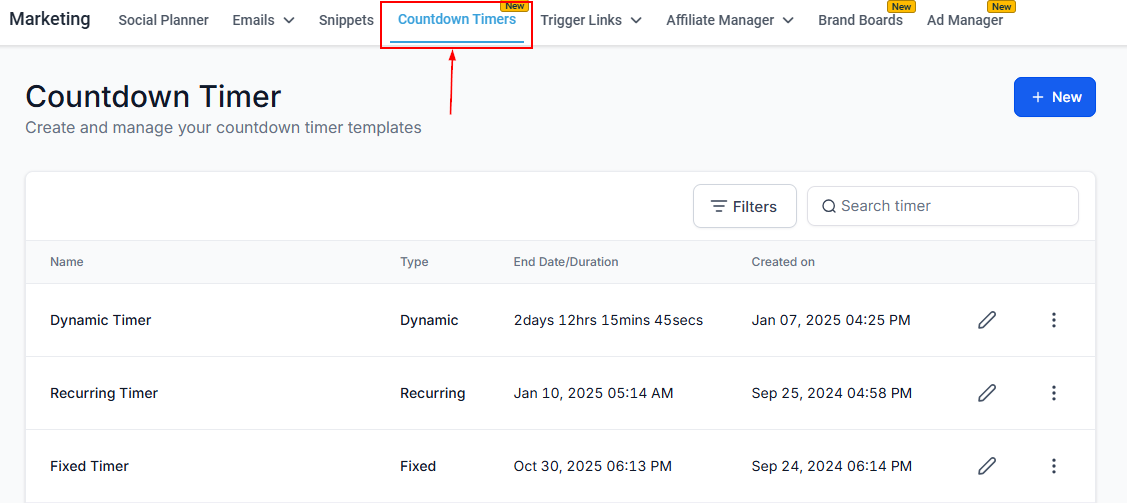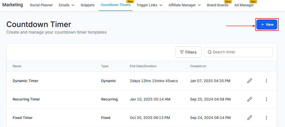 Click the “+ New” button in the upper right-hand corner to start creating your timer.